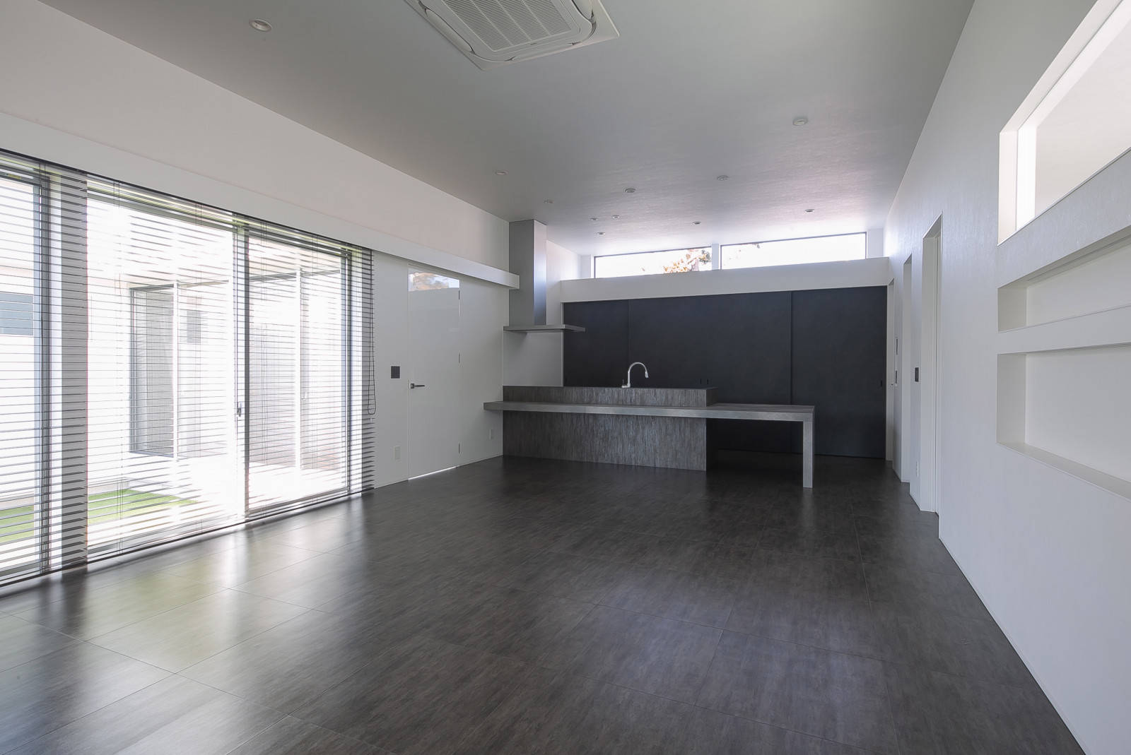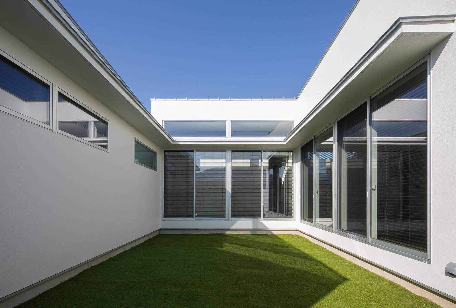 平面計画としては、建築の中央に大きな中庭を設け、それを囲んで居室を配置しました。中庭をそれぞれの一室の延長として室内に取り込みながら、中庭南にはRCの塀を設け、農地の樹木の上部のみを借景しています。中庭を介し、たっぷりの光が差し込み、気持ちよく 風が通り抜ける計画となっています。