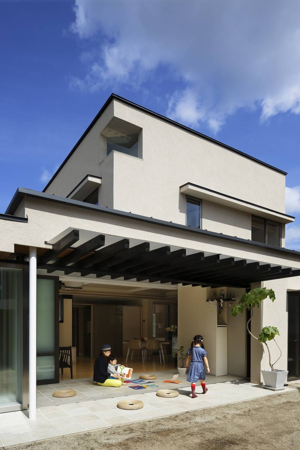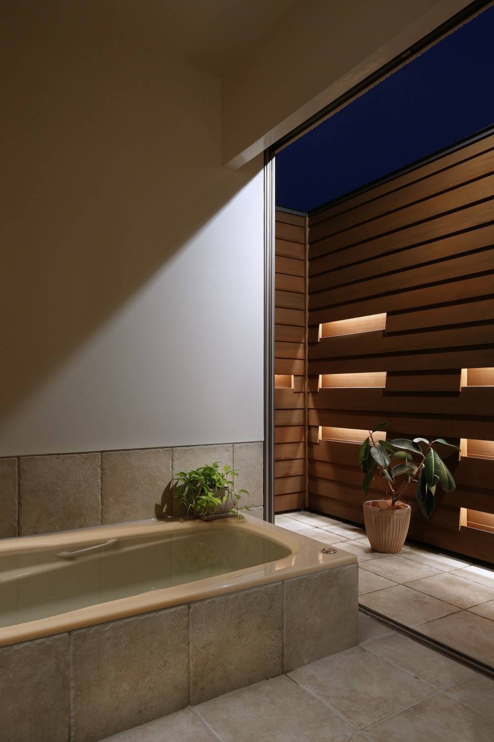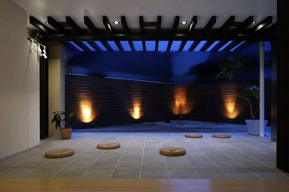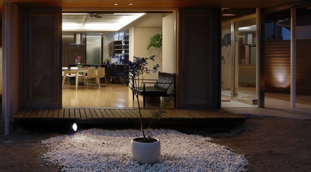 夜、夕景の外観からは暖かさがあふれ出しています。ブラインドが、スッと横のラインをダイナミックに描き、外の塀のラインと対応しています。 本当にきれいですよ。素晴らしい。