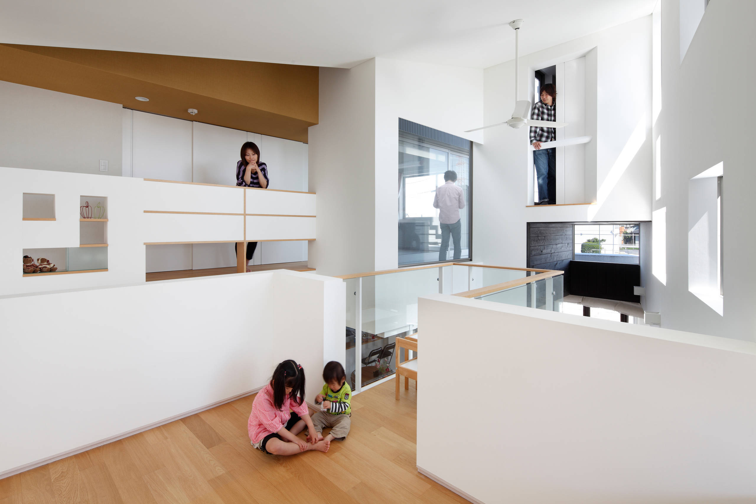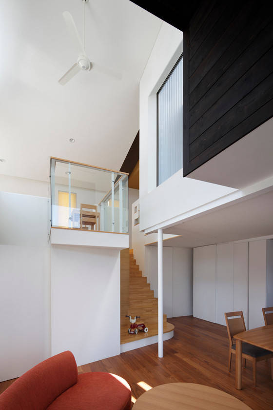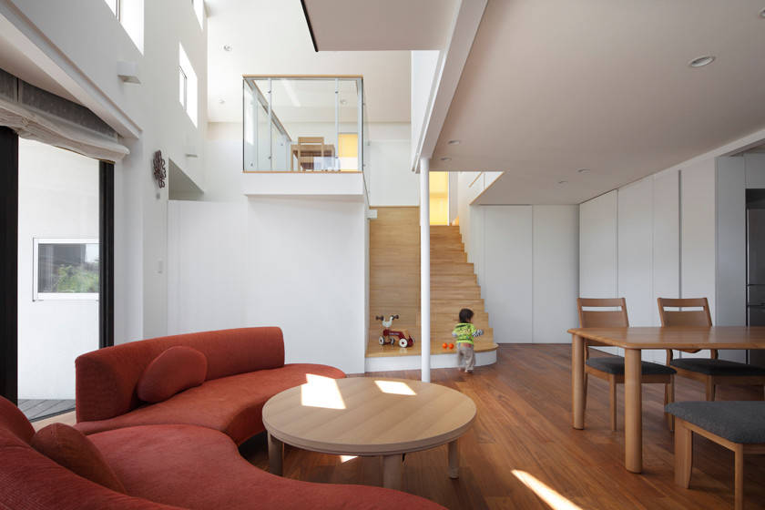 この住宅は、キッチンもお風呂も、子供部屋も、全ての部屋がリビングのような居心地づくりを目指したいところです。リビングは住まいの中心となる場所ですが、この住宅では、様々な場所にリビングコミュニティをしつらえています。とりわけ子供のスペースに家族リビングと子供リビングを吹抜けで結ぶことで、立体的にリビング性が広がったユニークな住まい。その吹抜けに朝、昼、夕方と光と影が移ろいます。