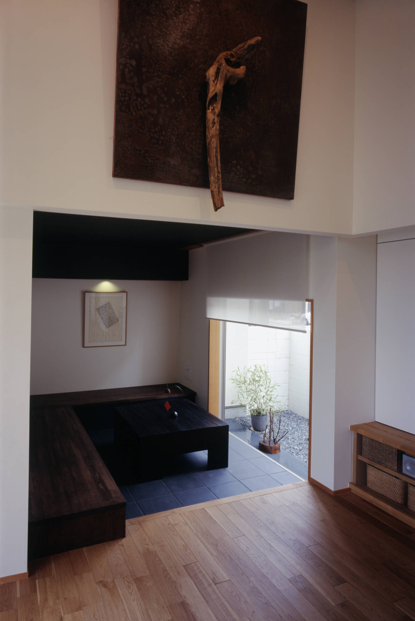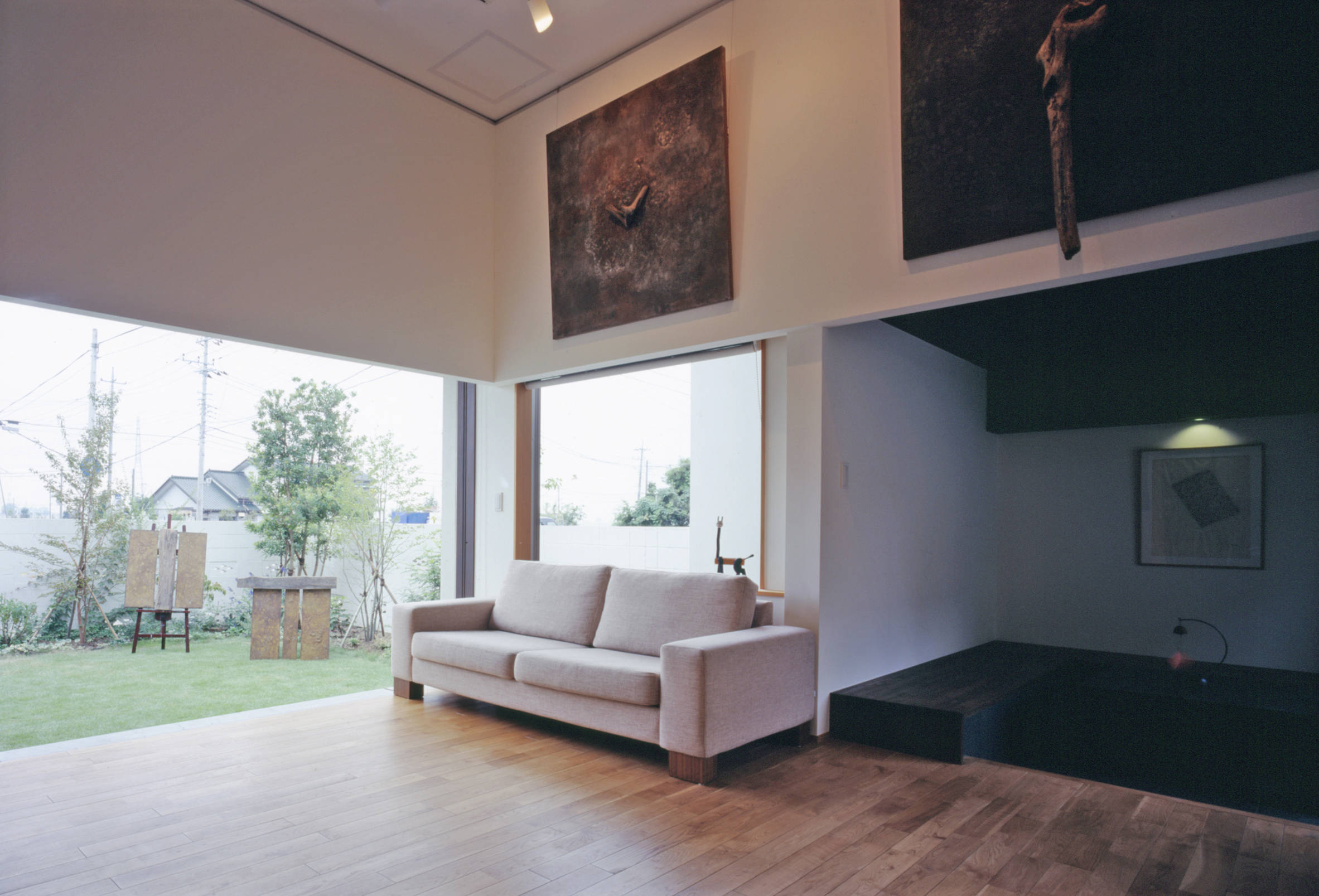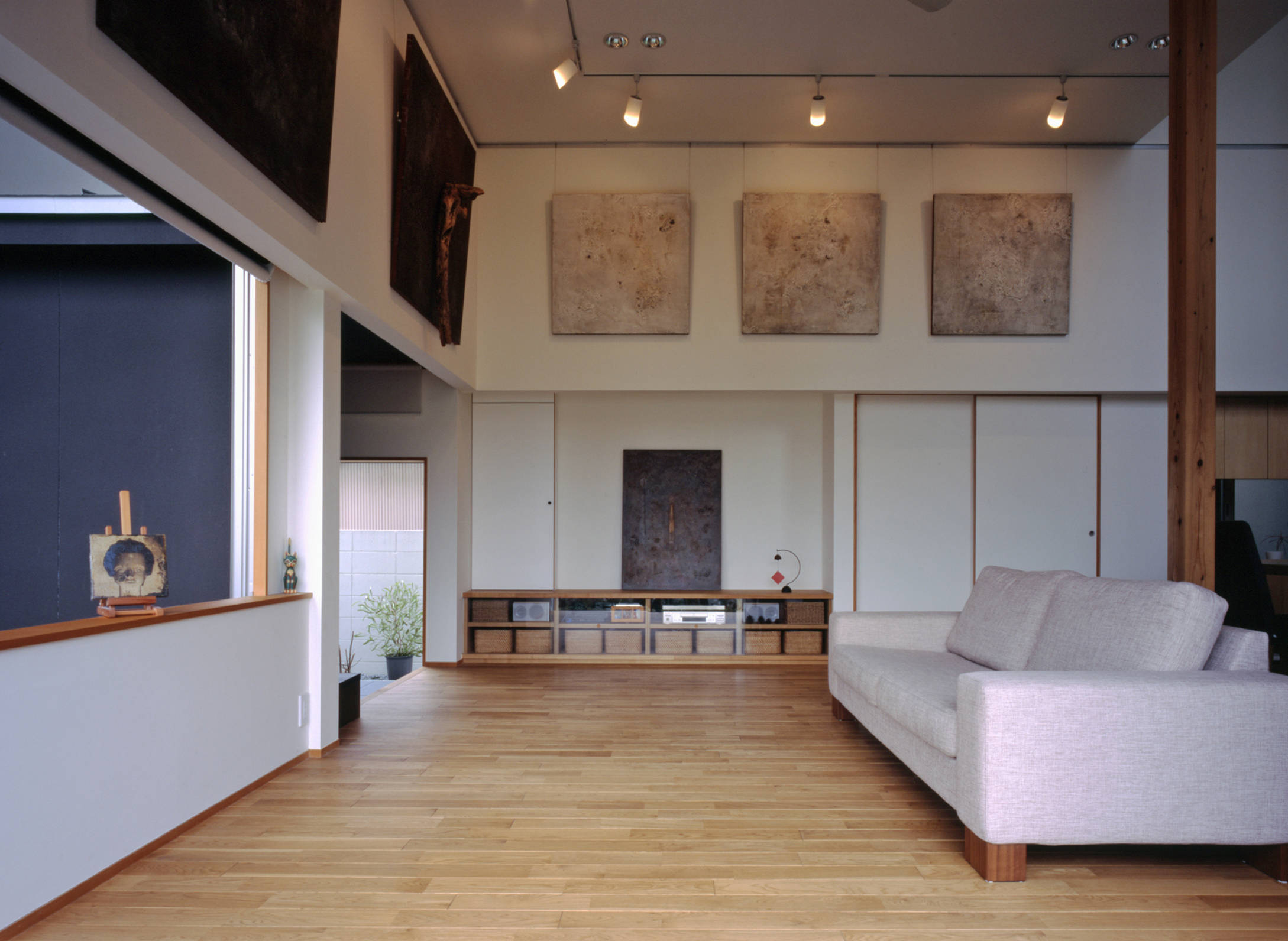 美術教師・アーティストであるクライアントが『自作と生活空間をしなやかに連続させて欲しいという』熱い想いを語りました。作品をつぶさに調査させていただき大型の作品も受け止められるギャラリーリビングを創出。丁寧にデザインしました。