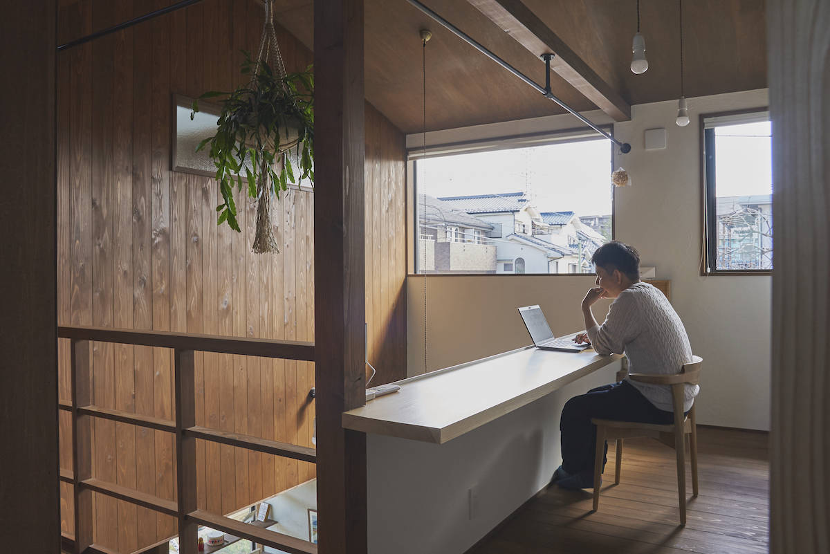 2階には1階の土間に面して吹き抜けがあり、読書ができるカウンターが設けられています。