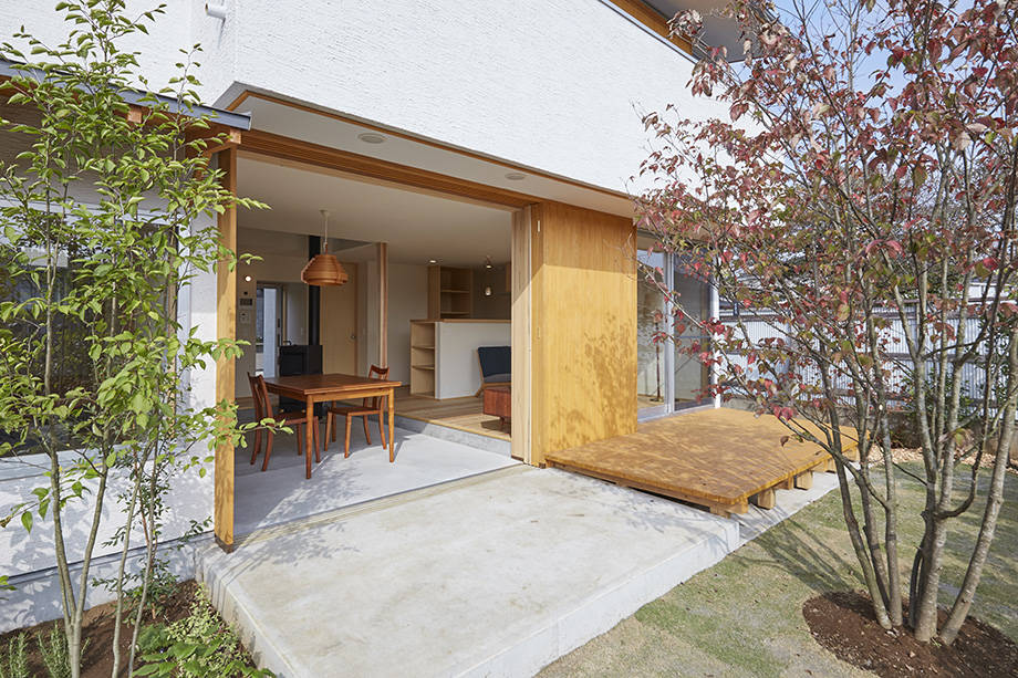 その土間から庭へと抜ける部分には2.5m幅の開口があり、この開口部をすべて引き込むことで内外が一体となった空間へと広がる。