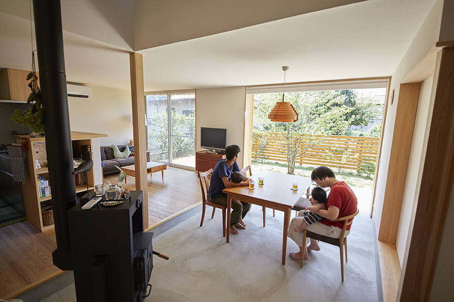 また、土間の蓄熱効果によって夏場はヒンヤリと、冬場は日射と薪ストーブによって暖かさを維持することが期待できる。