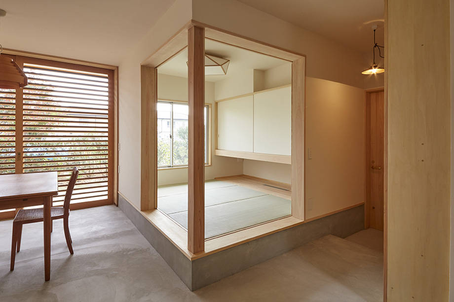 クライアントからは以前、設計した南大塚の住宅で計画した土間、庭とをつなぐフルオープンの建具の印象が残っていたようだったので、今回はそれをさらに発展させ内部に土間が通る計画とした。