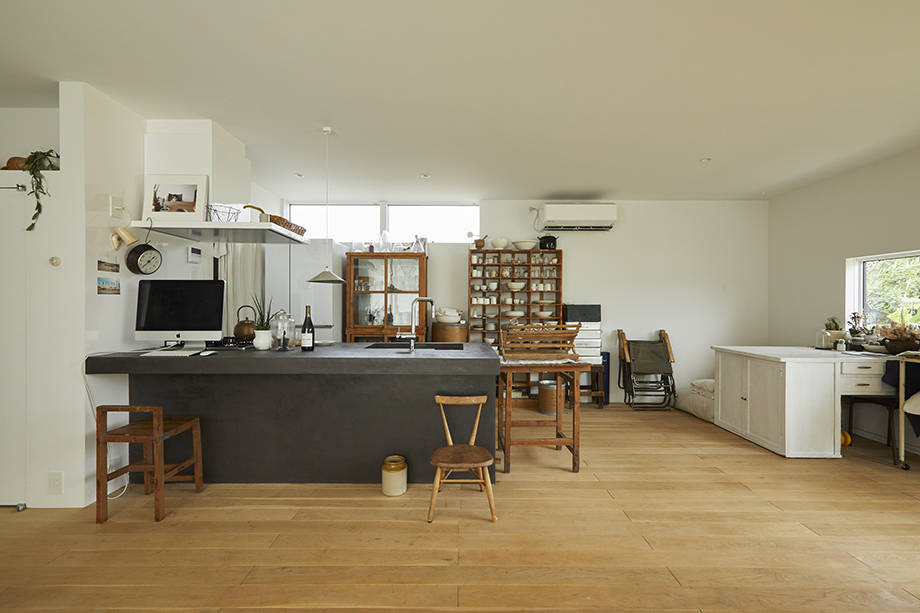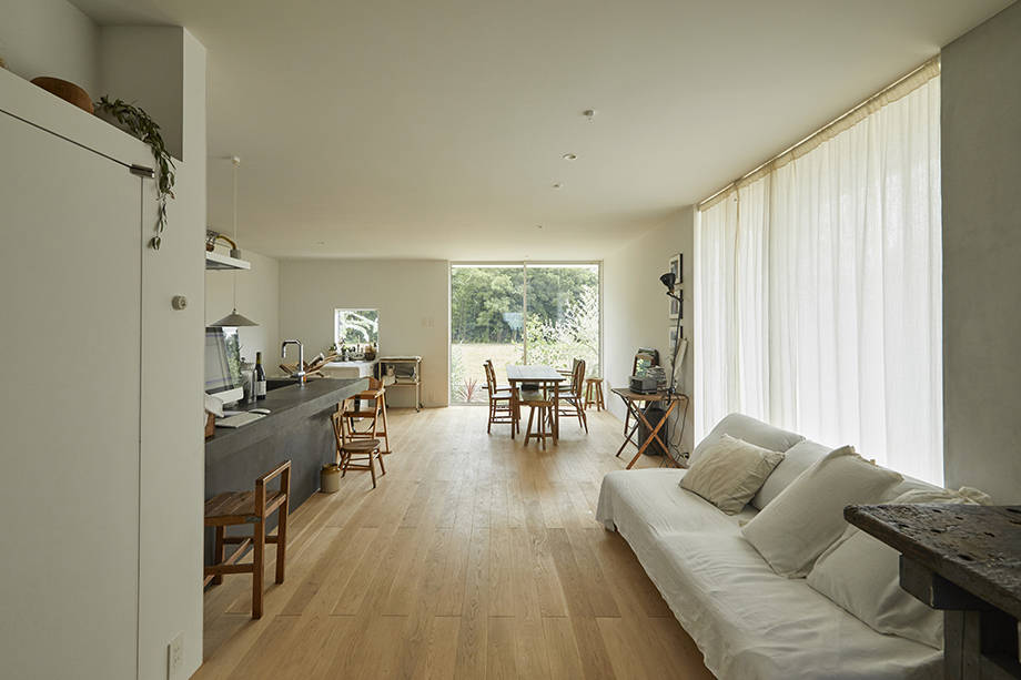 それに正対するようにリビングダイニング、キッチンが配置されている