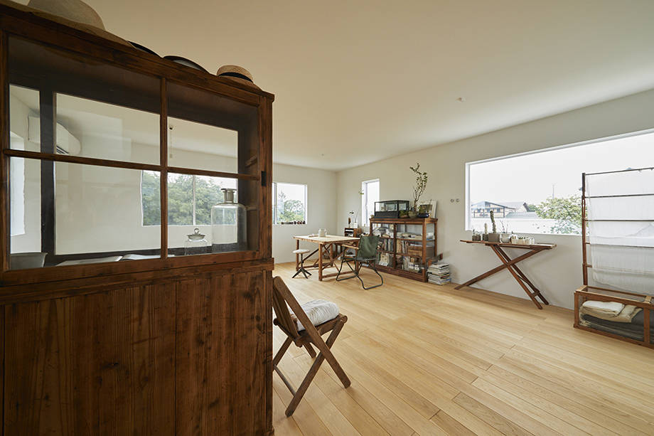 2階は寝室と将来的に子供部屋、個展なども行えるように柱のない大きなワンルームとしている。