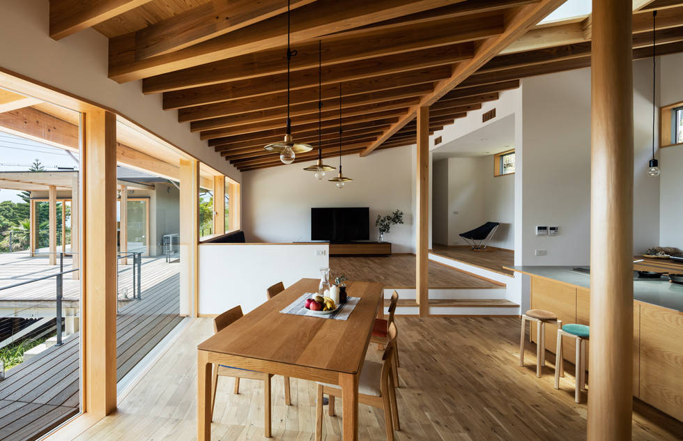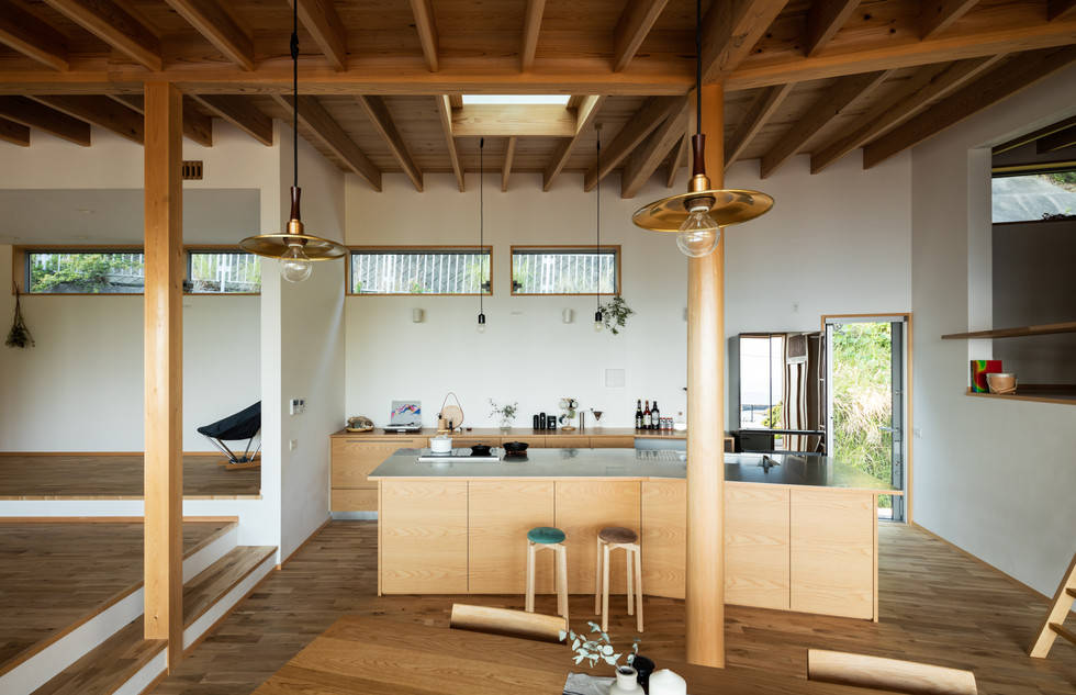 敷地内は既存の樹木があり、地面には高低差があるため、海への眺望を求めつつできるだけ平らでひらけた場所に建てようと考えると、敷地面積の割には建物を建てることができる範囲は限られていた。その限られた範囲に地を這うように母屋を計画した。室内は敷地内の高低差をそのまま取り込み、玄関から奥に進むに従いフロアレベルが変化していく。屋根の高さは一定であるため、プライベート度の高い奥の主寝室に向かっていくに従って天井高さが抑えられ、落ち着きをもたすようにしている。また、かつての記憶を残した場所で食事をとりたいとのクライアントの意向のもと既存の建物が載っていた鉄骨を一部残し、上部に食事の場である小さな離れとデッキを計画した。