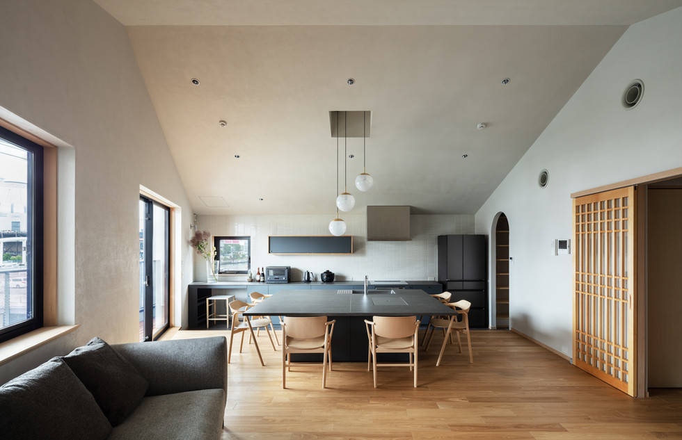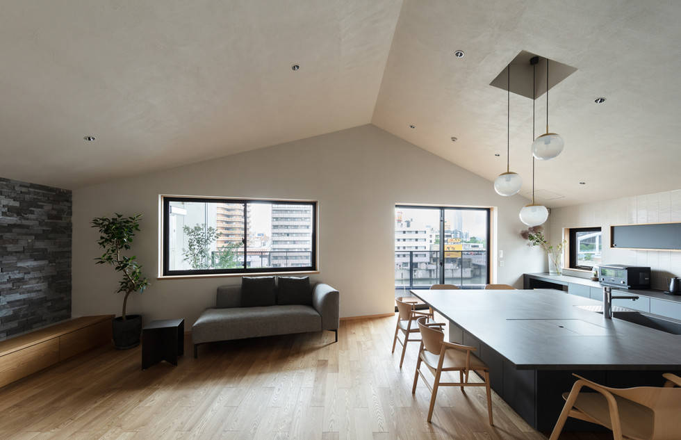 準工業地域のこのエリアには、工場や商店と住宅が一体になった建物が多く建ち並んでいる。ここに建っていた以前の住まいも元々は1Fに建て主の会社が入っており、その上が住居となっていた。築約50年の建物は改築が繰り返され、一度訪れただけでは迷子になるほど入り組んで造られていた。大変面白い建物であったが、老朽化や構造的に不安な事もあり建て替える事となった。
