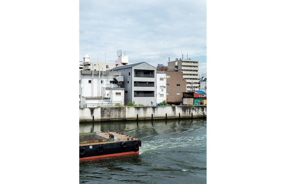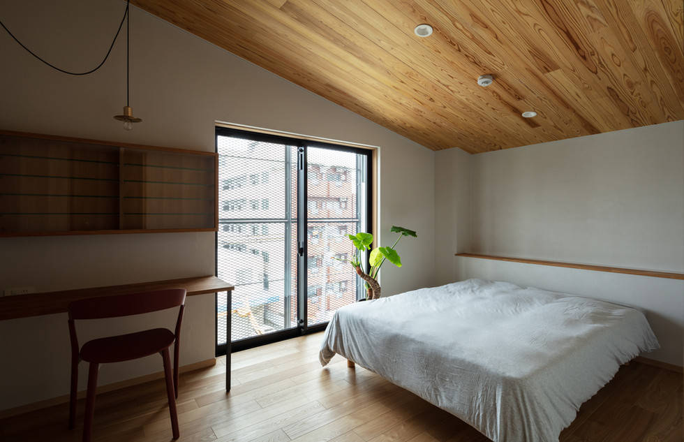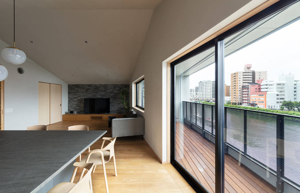 敷地は全面道路側と川側の両面からよく見える場所である。すぐ近くに幹線道路が通っており人通りが多く、通風や採光のために窓を多く設けて欲しいとの要望があったが、そのまま単純に窓を設けることには不安があった。川側は橋からの距離が図面で見るよりも近く感じられたため、川側の外壁面を少し振る事で心理的な距離を確保している。道路側については、雨の日でも窓を開けることができるようにケラバの出を大きくしており、それによって生まれた余剰空間を設備機器の置き場とし、設備機器を隠し外部からの直接の視線も軽減でき通風採光をとれるようエキスパンドメタルによるパネルにて外壁面を構成している。