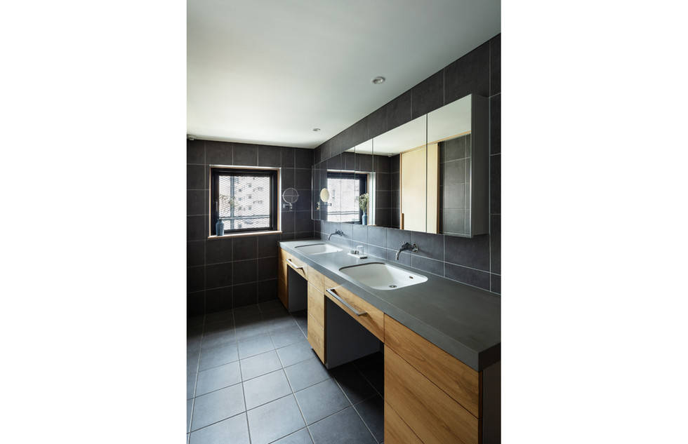 元々会社が入っているような大きな建物に住んでいた建て主の持ち物(一般的な住宅にはないスケールのもの)が入るように設計を進めたところ、住宅のはずが工場のような何とも言えない不思議なスケール感が生まれ、それが周囲の風景と馴染みつつも何か少しズレがあるような建築ができたように思う。