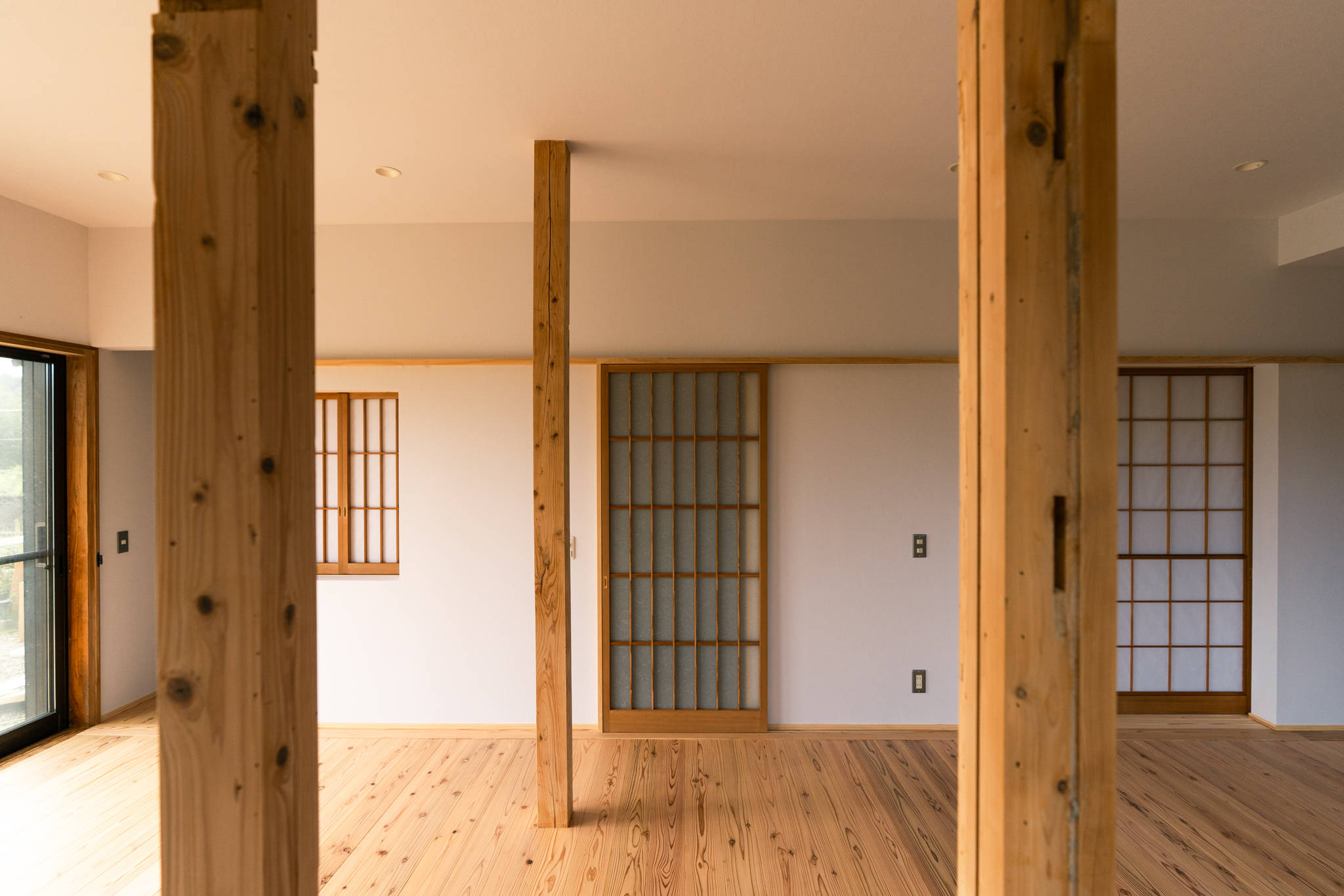 屋根、外壁回りは築年数の割に痛みなども少なかったため外部は既存のままとし、窓や出入口の位置は変えずに内装のみの改修としている。既存の障子や襖などの建具も状態が良かったためほとんどの建具は襖や障子を張り替えながら新設建具として転用している。プランも一見大幅に変更しているように見えるが、現況の窓や壁配置、柱割を活かしながら家の中心となる和室回りの動線の整理と、LDKの機能が入る主室の整理を重視した。