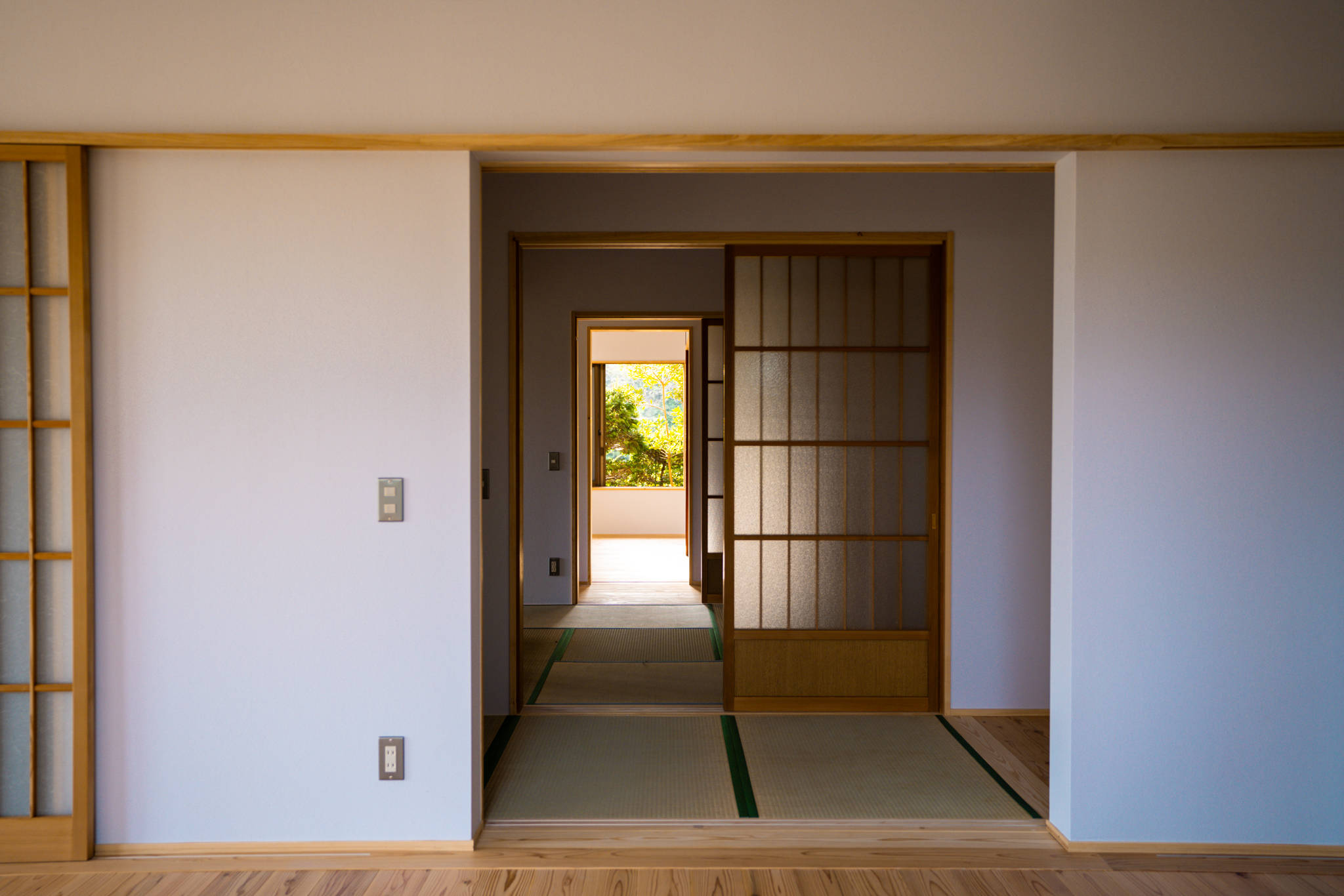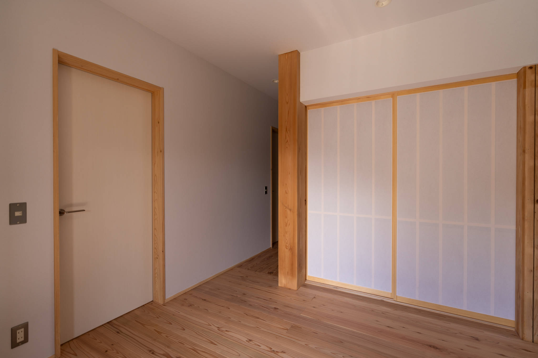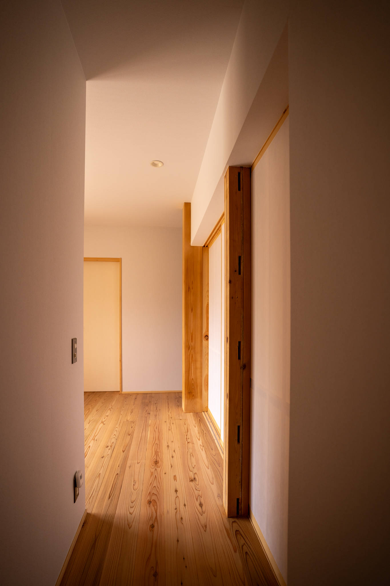 主室は単に壁を抜いた大部屋とするのではなく、床座コーナー、書斎コーナー等の小さなスペースやカウンター、ベンチが付随する居室とすることで多様な居場所を持ち合わせた居住空間である。家の中央にある和室は三方を取り外し可能な引き戸で囲われた構成とし、廊下や主室とつながる開放性の高い空間としている。