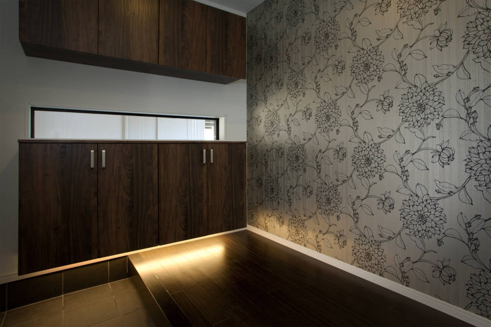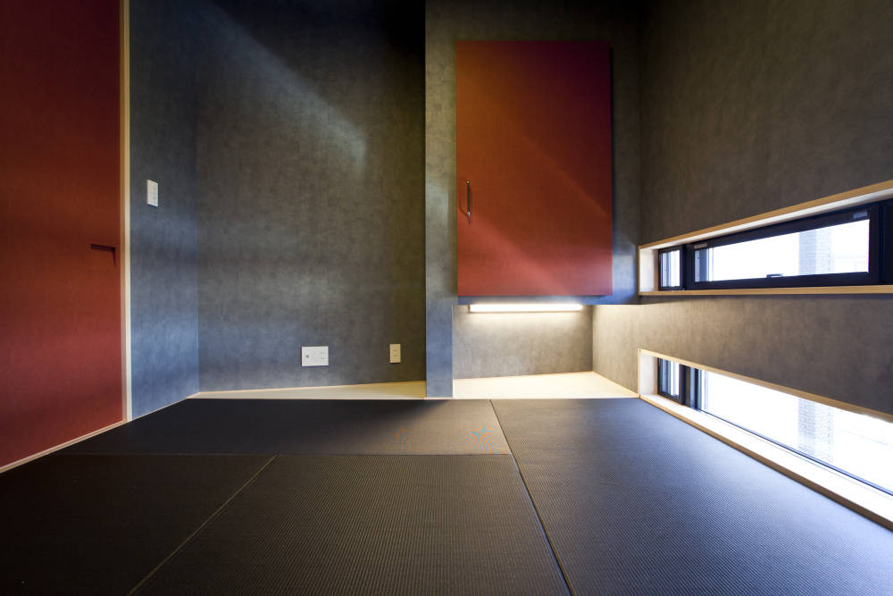 外壁にはメンテナンスフリーの素材を使用。内部は、間仕切り壁に光を通す素材を使用して、明るく開放的な印象に。一部屋だけある和室は、赤と黒を用い他の部屋にはないシックな印象になっています。