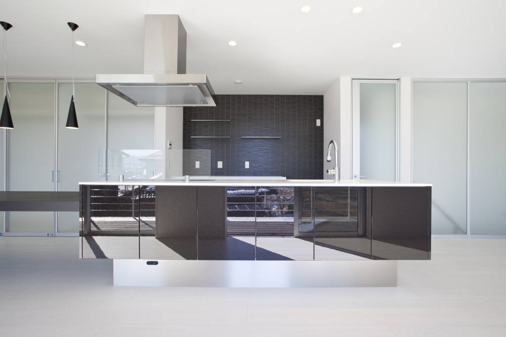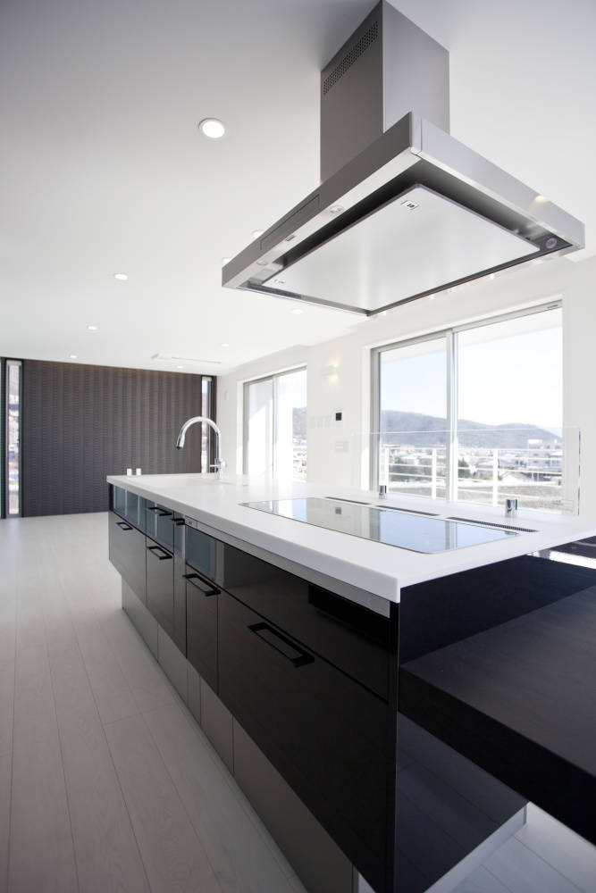 朝日が差込む時間から夕景、そして夜景へと、太陽光がもたらす自然の贈り物を時間の経過と共に家の中に取り込めるように設計しました。家族が集う、リビング・ダイニング・キッチンを2階にレイアウト。中央に設置されたキッチンで景色を見ながら食事を作る。最高です!