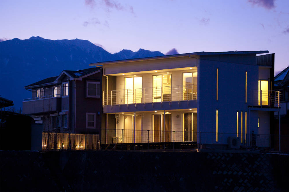 敷地東エリアが大きく開けて河の流れが見え、その先には富士山を望むことができる、とても眺望のいい家。
