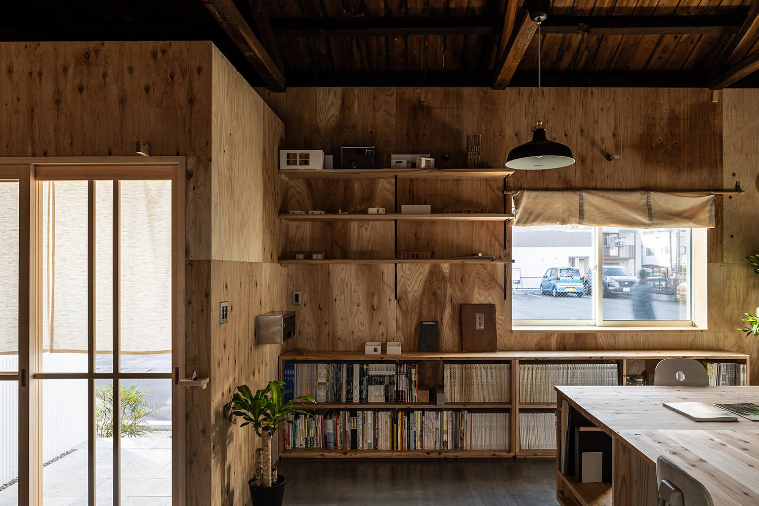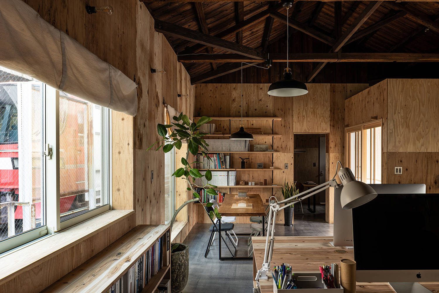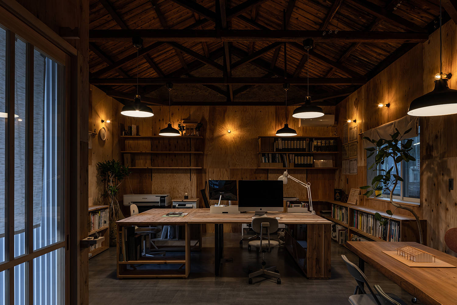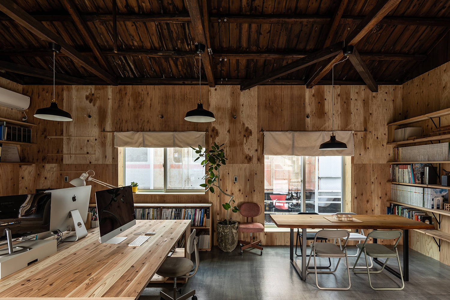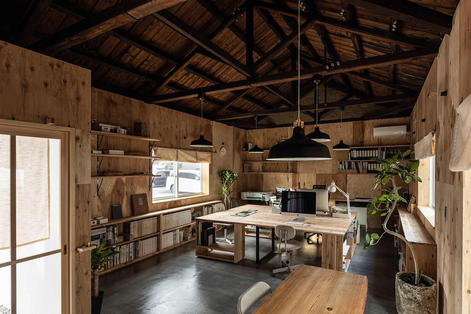 また室内の仕様は、コロナ禍や物価高騰などの影響もあり、現在の一般的な事務所の仕様では敢えて進めず、建築物として成り立たせるために必要な最低限の材料「以外」のものを一旦そぎ落とし、用途的に必要となる機能を担う材料だけを拾い上げました。空間自体は、小屋組がトラス構造となっているため、広がりのあるボリュームが確保できることから、今後のこの場所の展開を見据え、将来的に他の用途でも上手く使えるよう、間仕切りなどの隔てるものを削減した間取りとなっています。