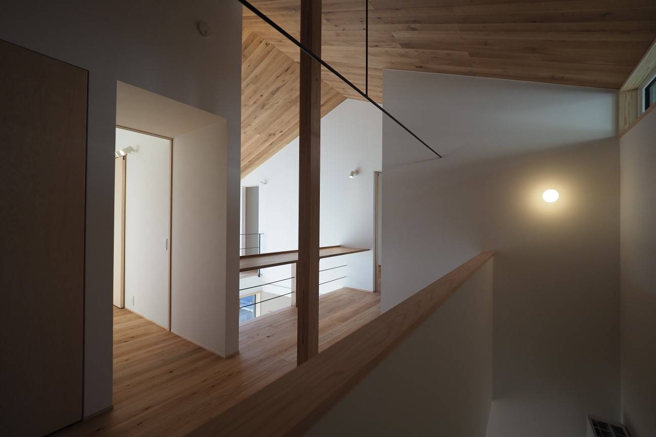 吹抜けを、平面的にも立体的にも家の中心に配置する事で、吹抜けを介して、人・日差し・空気 がグルグルと回遊できる間取りとなっています。