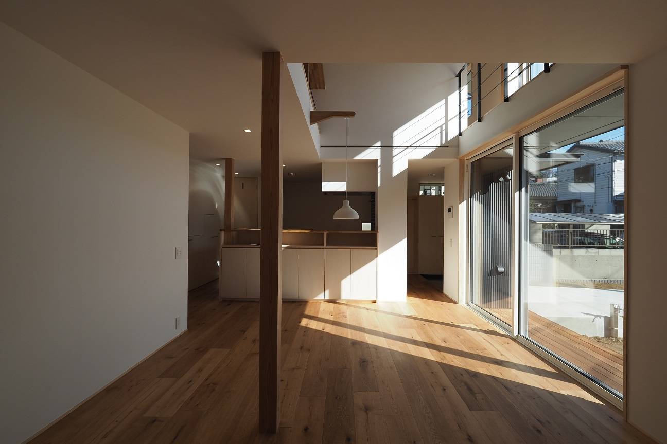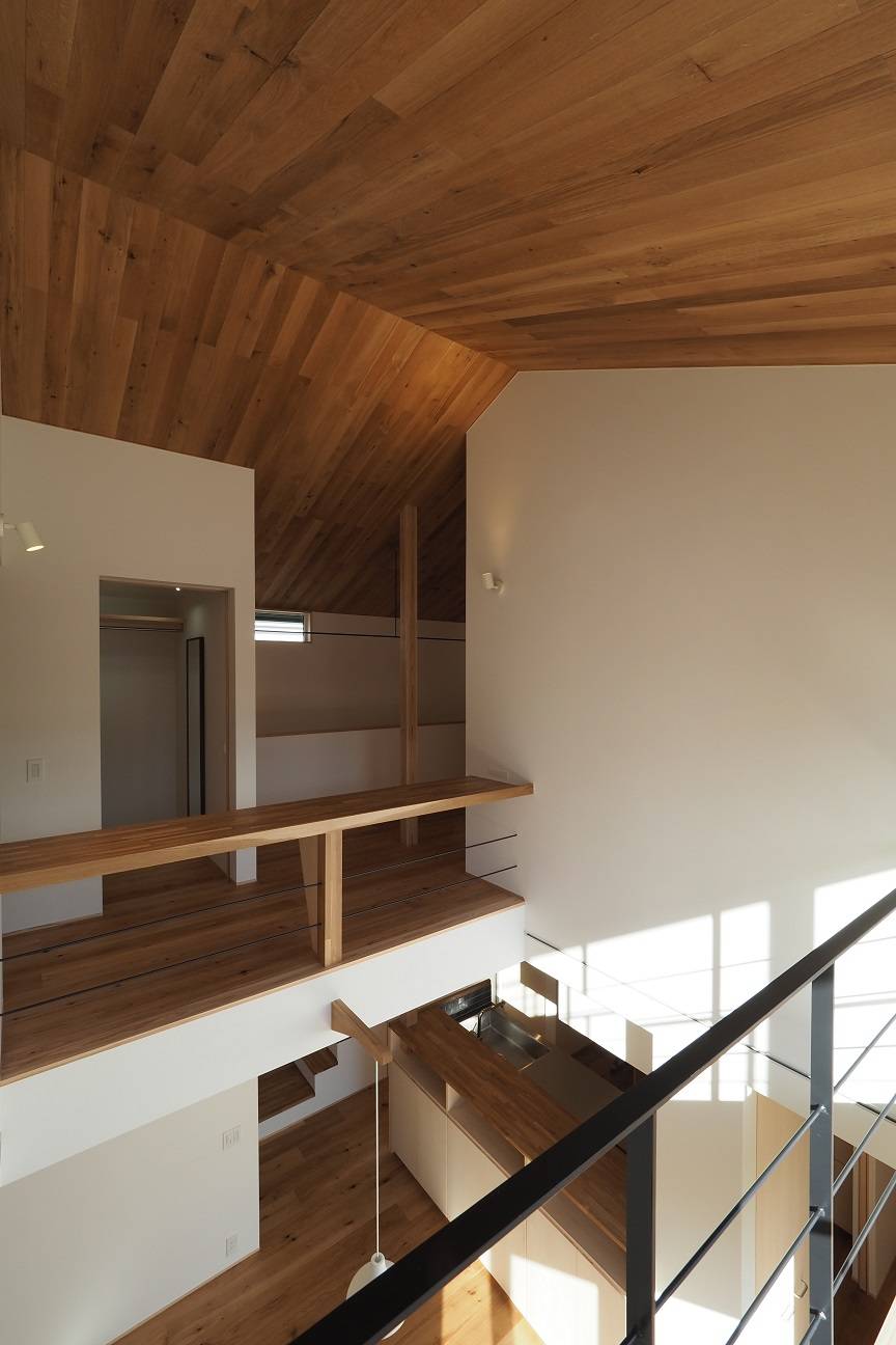 木造2階建て、延床面積28坪(93㎡)、大きな吹抜けのある住まいです。