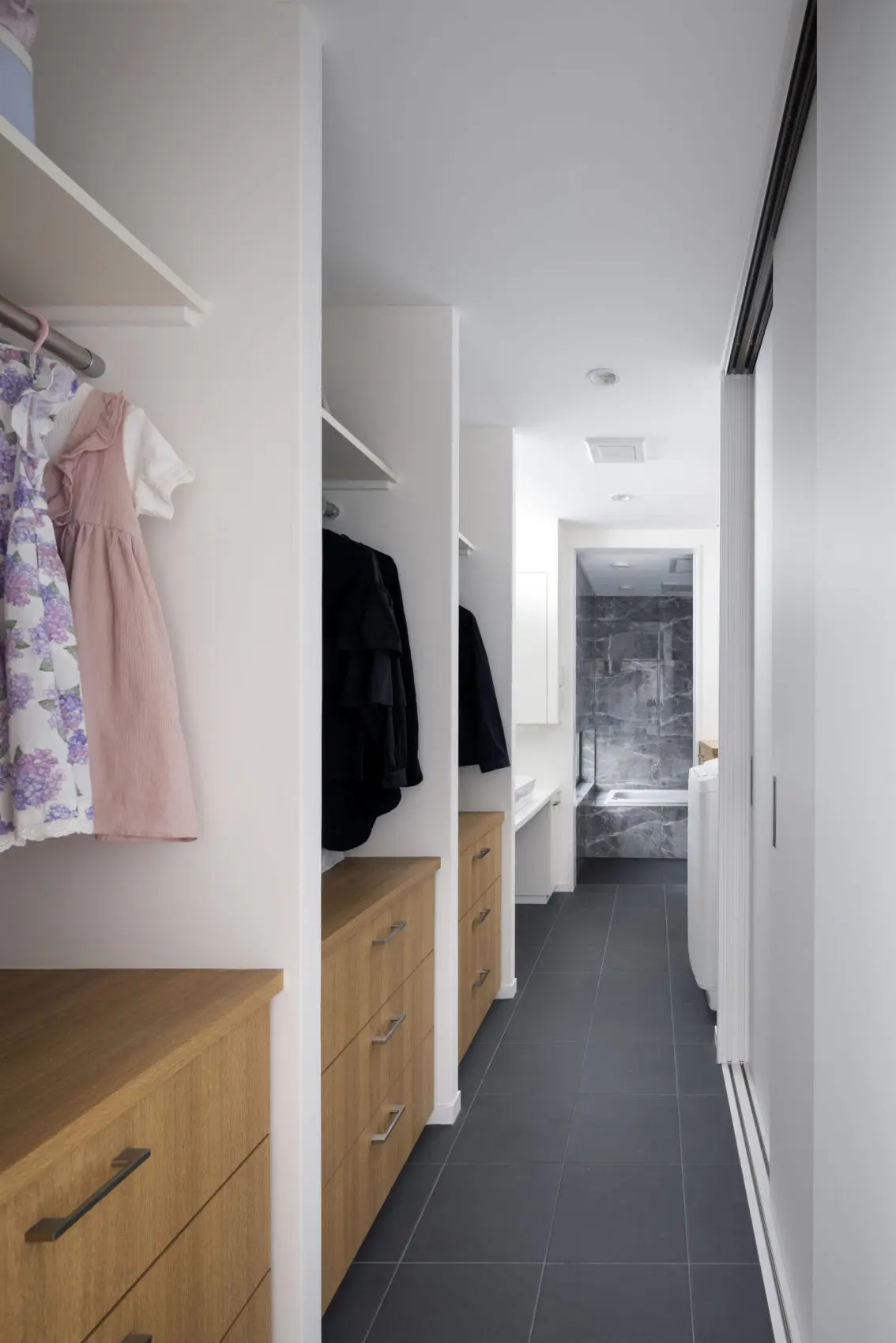 洗面に隣接するファミリークローゼットは、メジャーリーグのロッカーをイメージしたもの。キッチン横にパントリーも備え、収納はたっぷりと確保した。