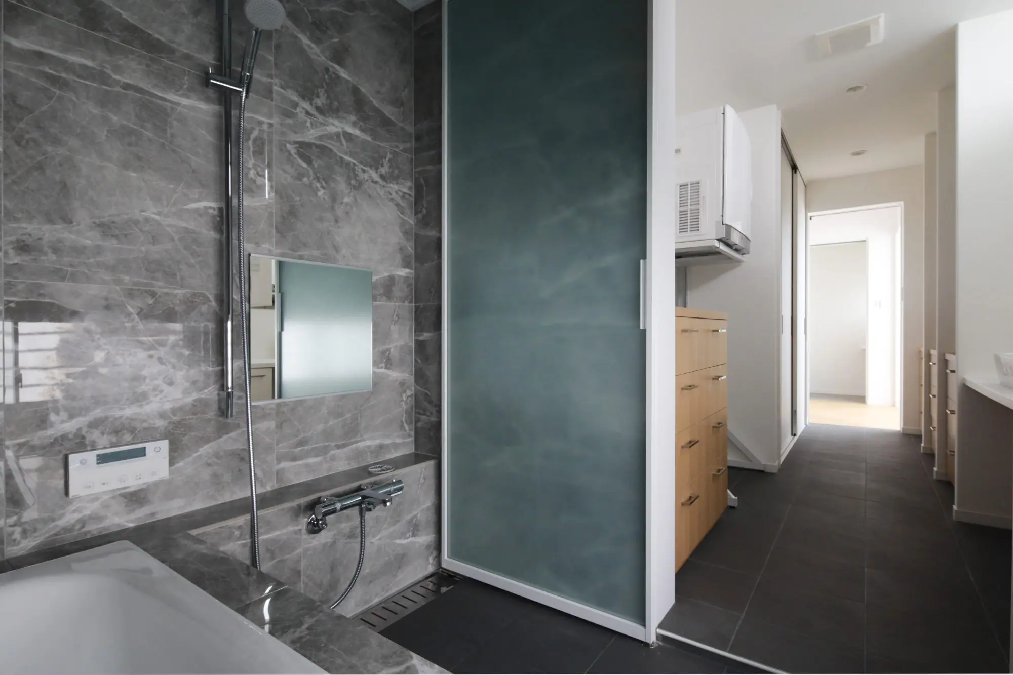 キッチンの後ろに水回りを集中させ、家事動線が大変コンパクトになっている。