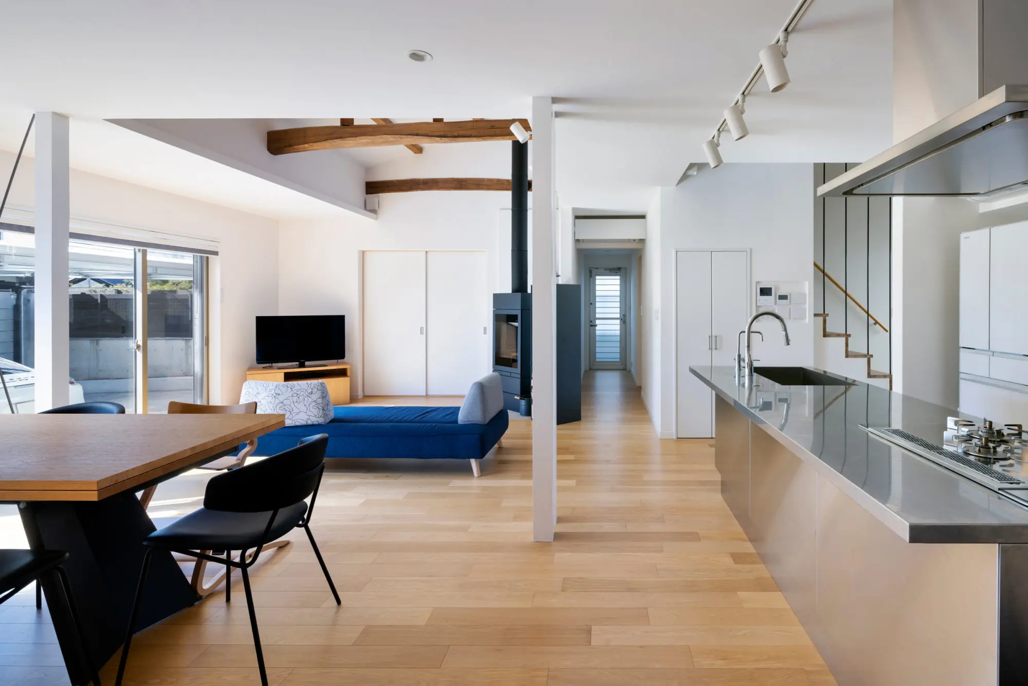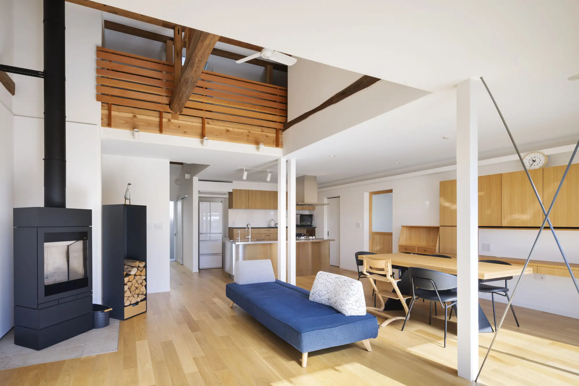 リビングの一角には薪ストーブがある。高性能な機種で、炎がゆらぐ風景と共に暖房器具としての期待も高い。