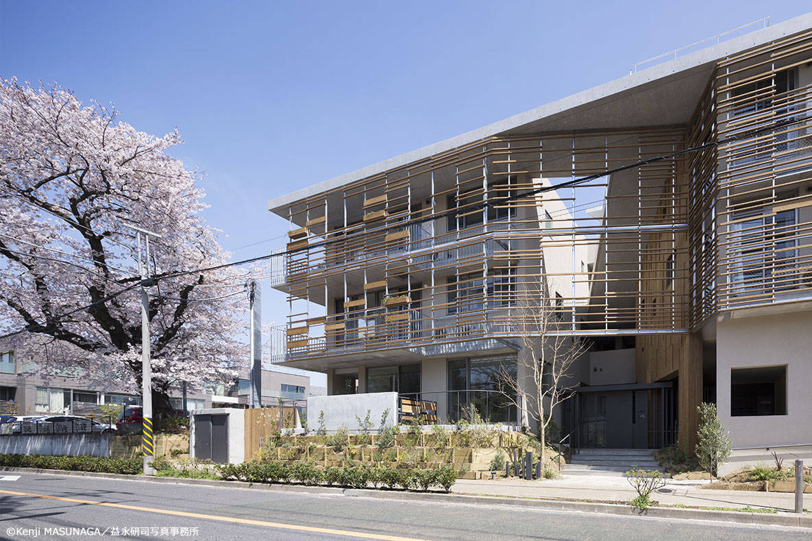 外周の木製ルーバーは、外部からは程よい目隠し、室内からは窓の外にあるもう一枚のフィルターとして機能し、バルコニーを外部と気軽に触れあう住まいの場として提案しています。