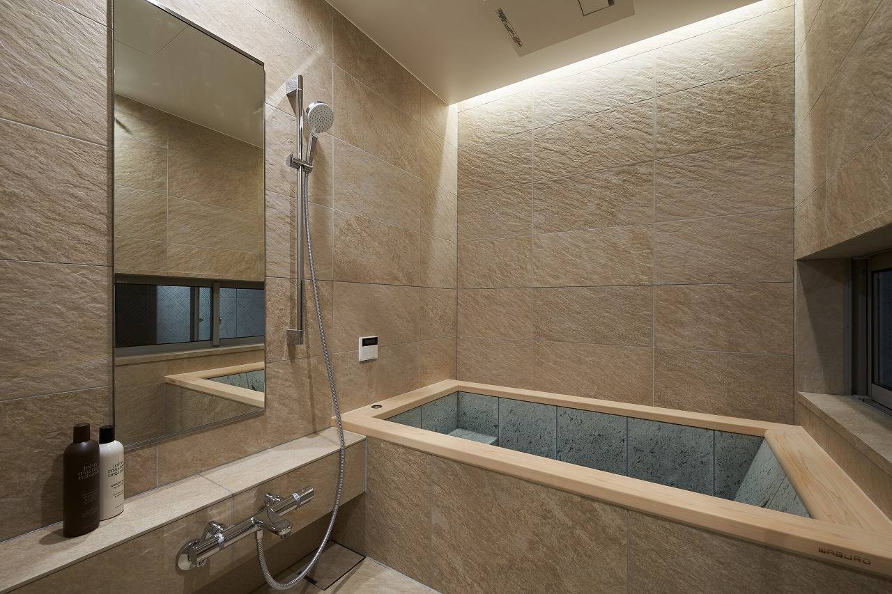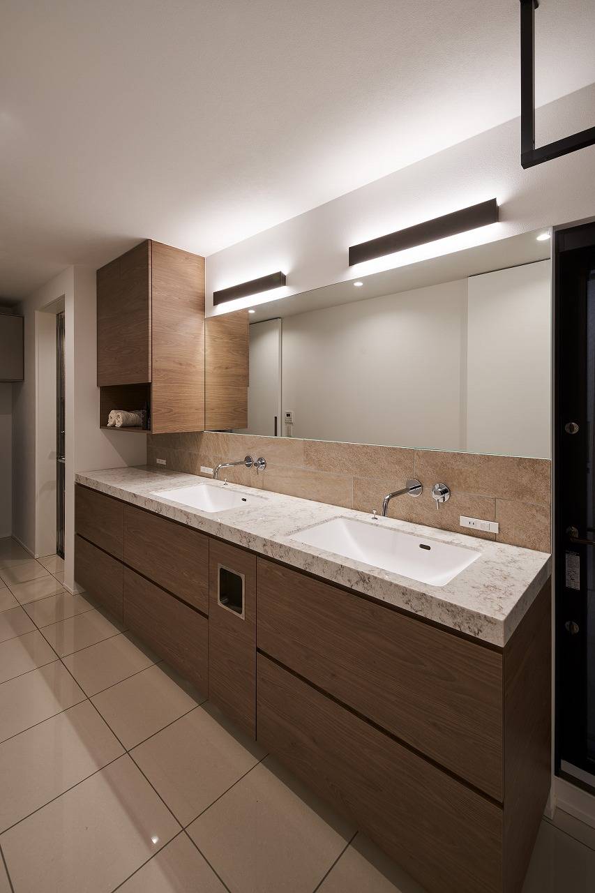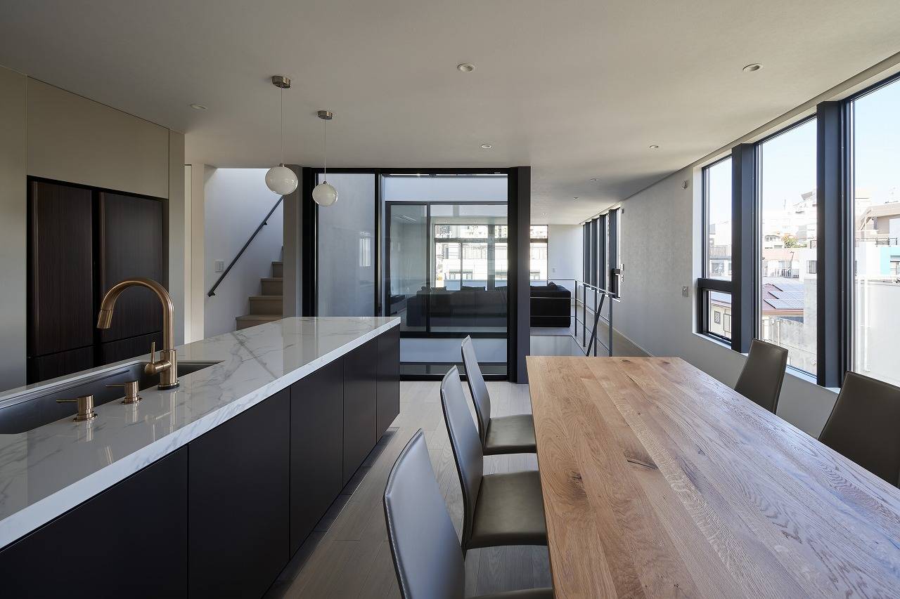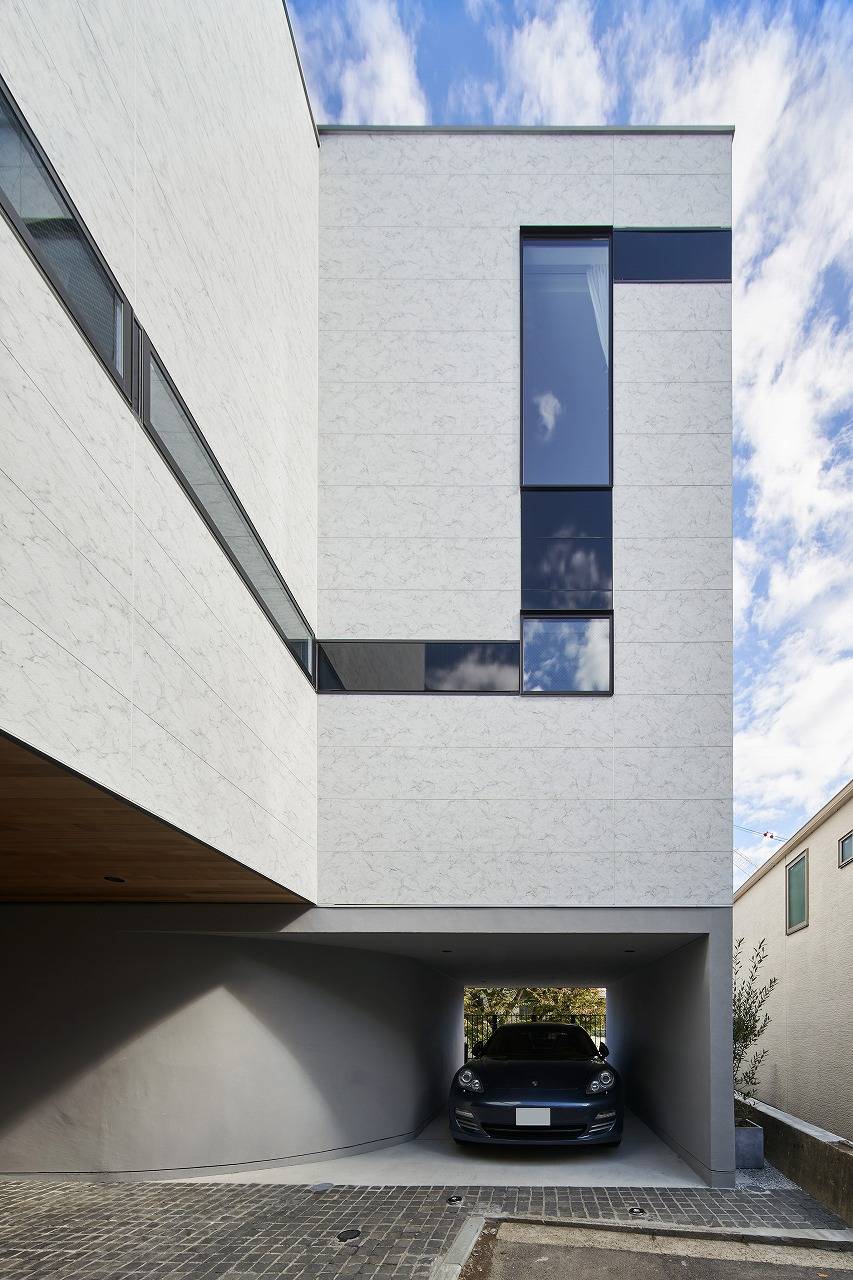 そこで、内部の主要なスペースは全て隣地の低地側に配置しました。この低地側には大きな木々が点在しており、主に1階はこれらを借景として取り込むことを目的とし、道路側には玄関ポーチを兼ねた車の切り返しスペースを設け、車庫は90度回転し隣地側に配置することで、車庫の背景に「景色」を取り入れました。内部の平面計画は建物中央に坪庭を設け、さらにこれに沿って廊下や階段を設置することにより生活動線に外部を取り入れました。一般的に坪庭は建物の外周を閉じた場合における設計手法ですが、この計画では周辺環境の外部空間を取り込みながら、それに呼応するように建物内側にも外部空間をつくり、各スペースの前後、あるいは表裏を曖昧にすることで空間の広がりを加速させています。