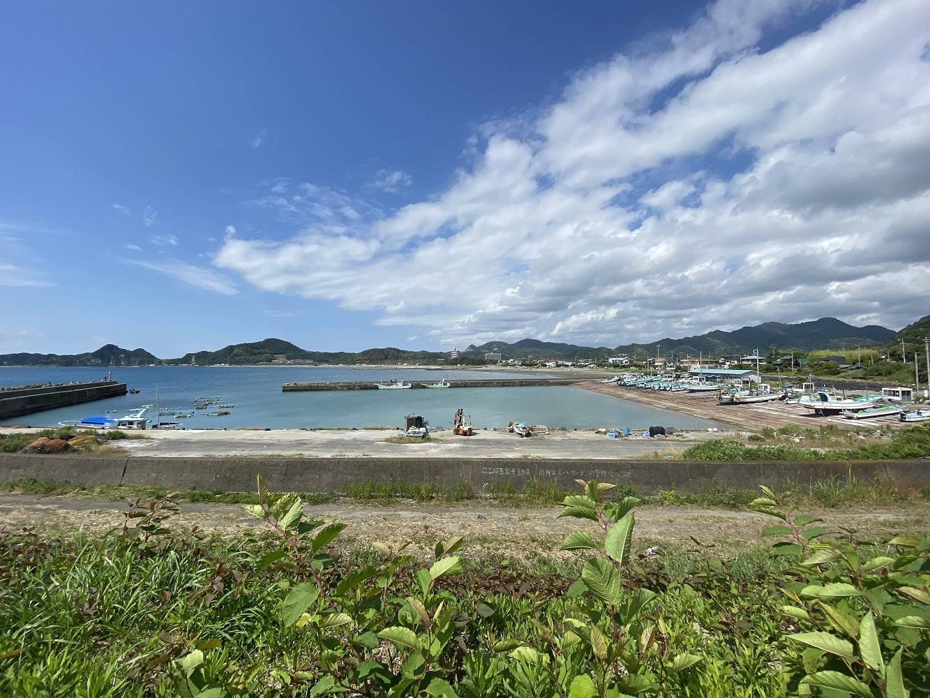 目の前にある漁港では時折、漁船が往来し、防波堤でのんびりと釣糸を垂れる釣人の姿が見られる。