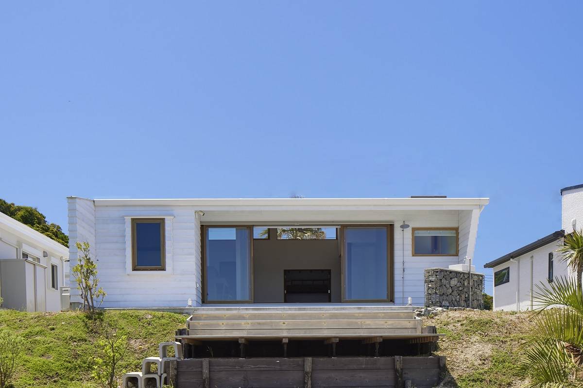 外壁は塩害に強い真っ白い塗料を塗った無垢材の下見張りで、凹凸部のストライプの影がビーチハウスらしい雰囲気を醸し出す。