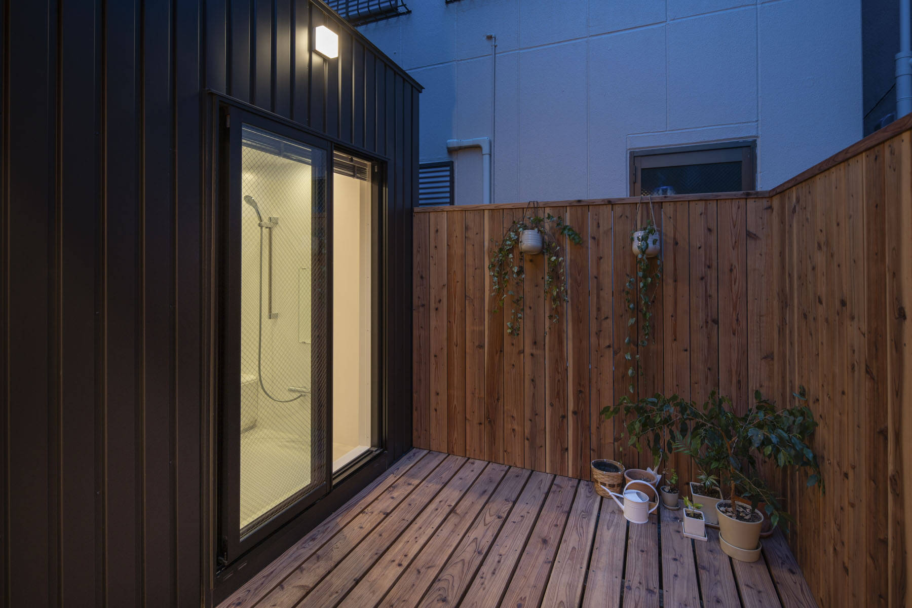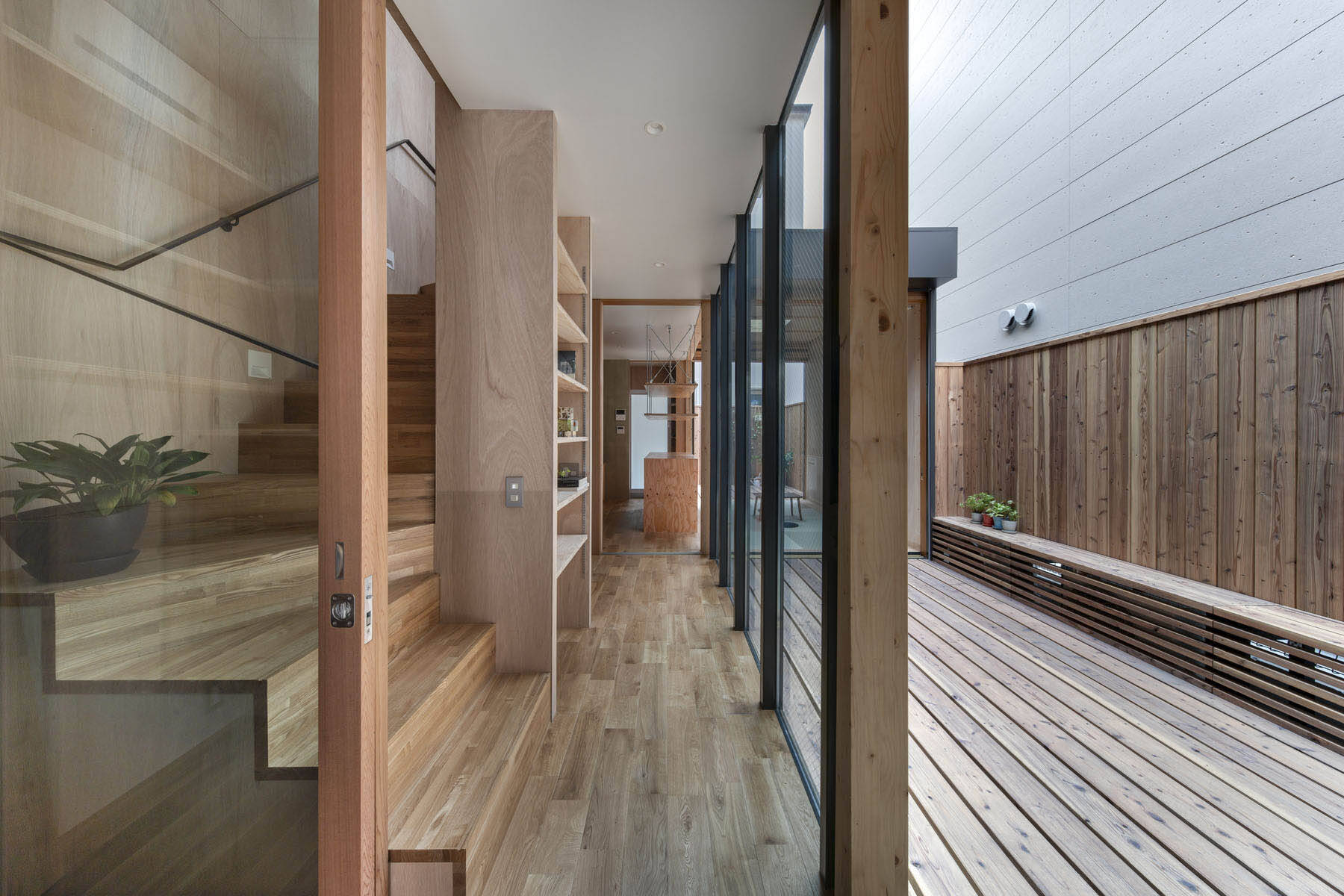 間戸の設えは中間領域やバッファーゾーンといった曖昧な余地を残さず、ある閾値を超えた瞬間にONとOFFが入れ替わる離散的なものです。室内外は透明性やシームレス性の獲得を目指して素材を統一することなく、あくまで機能的な必然性から適材適所で選択され、間戸を開け放った状態でも厳然と内部は内部、外部は外部であることを明示し続けています。そうやって生まれた古典的な「間」と「間戸」との関係性は、どこか長屋が持っていた空間の気積やつながり方を想起させます。