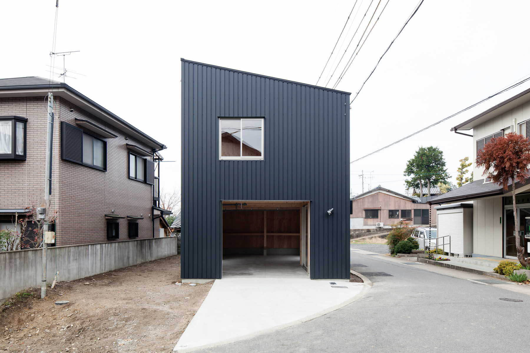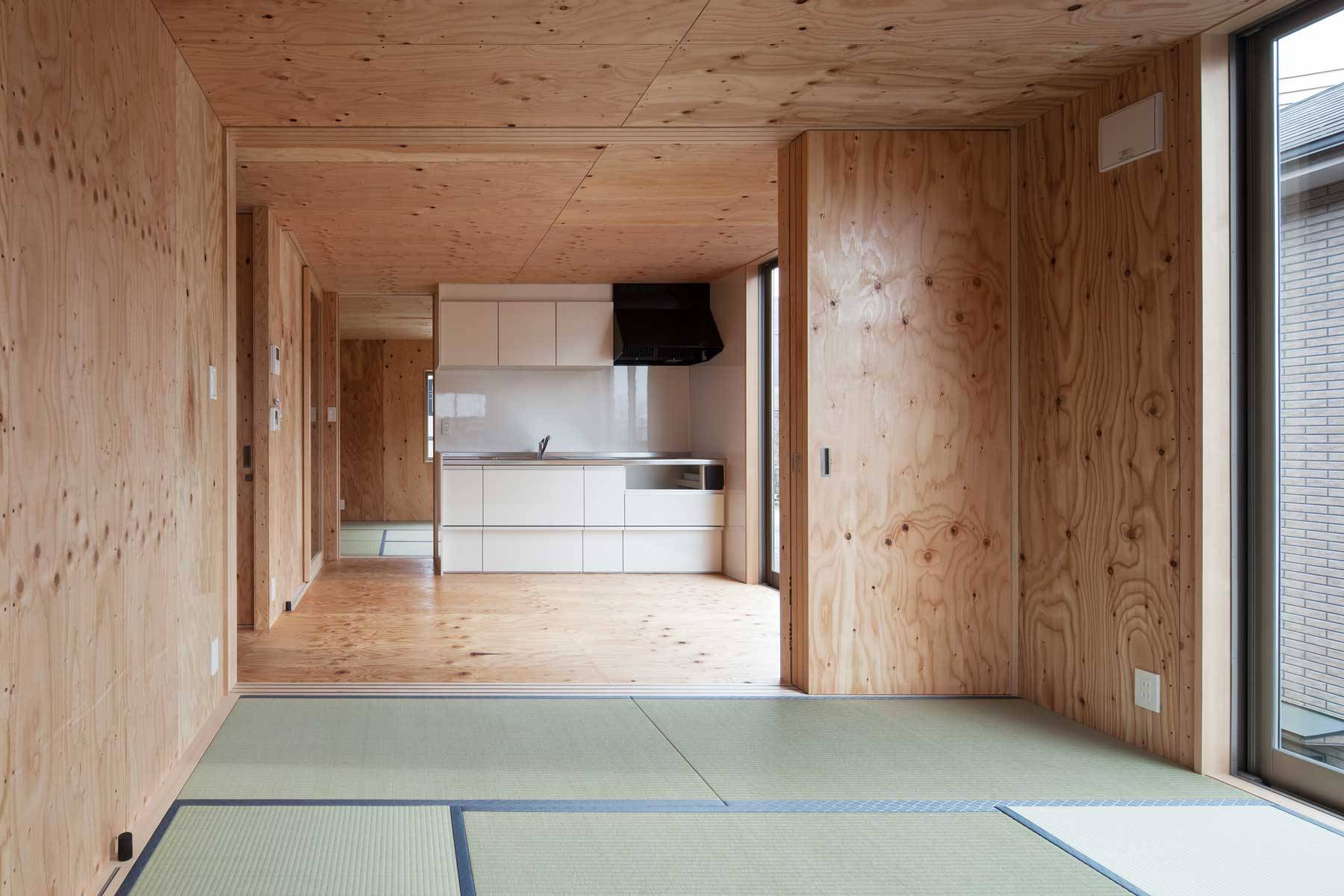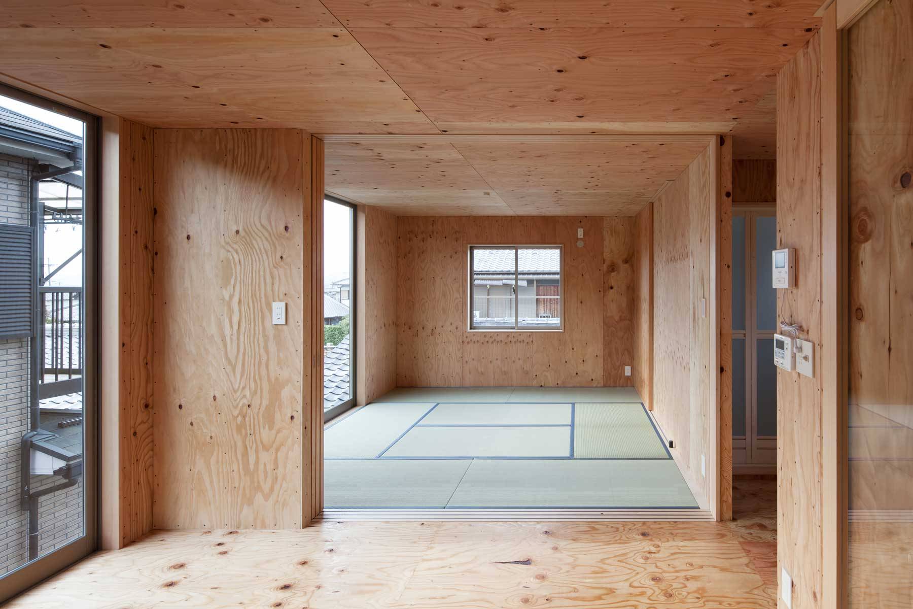 のどかな村落の中に計画した小さな住宅です。公団住宅で生まれ育ったお施主様のご要望は、出来る限り団地と同じ条件の居住空間を再現することでした。玄関に直結するダイニングキッチン、廊下を挟まず隣接する多目的な和室、極小の水廻り(洗濯機は二槽式希望)、天井高も団地と同じが良い。一つだけ異なることは、趣味のための広いガレージが欲しいという事だけでした。厳しい予算の中、間取りを団地と同レベルまで切り詰め、構造材と仕上げを兼ね、素材や設備コストを最小限に抑えることで、1Fガレージ+2Fダンチのガレージハウスが出来上がりました。時にウサギ小屋とも言われる日本の団地ですが、そこで生まれ、暮らしてきた方々にとっては、コンパクトでエコな住まいの理想像そのものです。第二次大戦後、集合住宅のモデルとして団地を構想した先達たちの努力が住み手の中にしっかりと息付いている事を改めて感じる計画になりました。