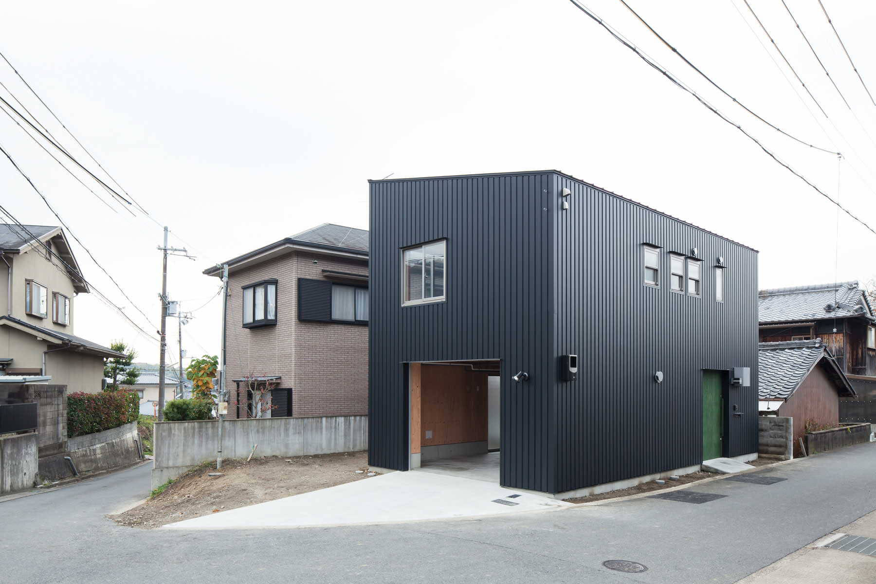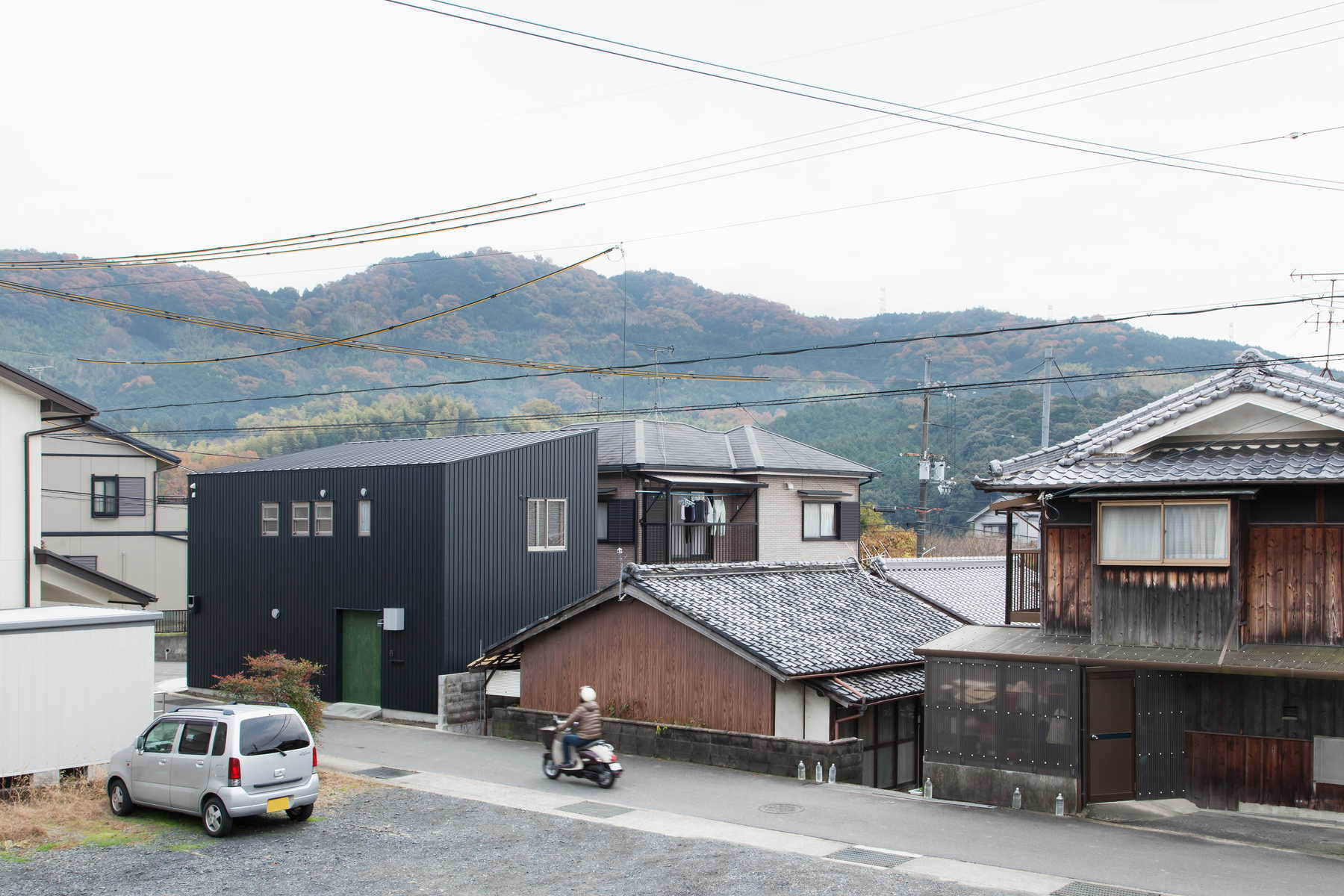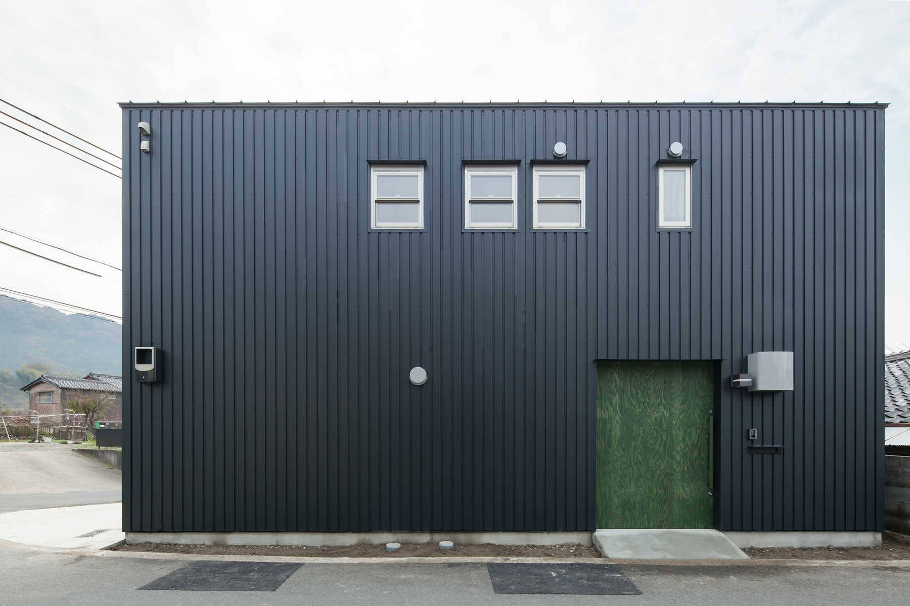 のどかな村落の中に計画した小さな住宅です。公団住宅で生まれ育ったお施主様のご要望は、出来る限り団地と同じ条件の居住空間を再現することでした。玄関に直結するダイニングキッチン、廊下を挟まず隣接する多目的な和室、極小の水廻り(洗濯機は二槽式希望)、天井高も団地と同じが良い。一つだけ異なることは、趣味のための広いガレージが欲しいという事だけでした。厳しい予算の中、間取りを団地と同レベルまで切り詰め、構造材と仕上げを兼ね、素材や設備コストを最小限に抑えることで、1Fガレージ+2Fダンチのガレージハウスが出来上がりました。時にウサギ小屋とも言われる日本の団地ですが、そこで生まれ、暮らしてきた方々にとっては、コンパクトでエコな住まいの理想像そのものです。第二次大戦後、集合住宅のモデルとして団地を構想した先達たちの努力が住み手の中にしっかりと息付いている事を改めて感じる計画になりました。