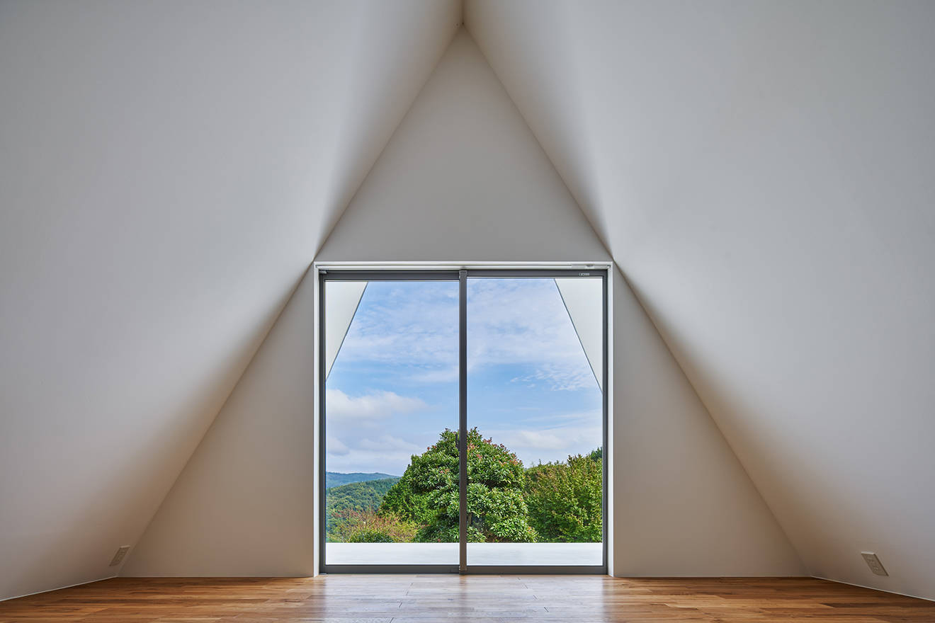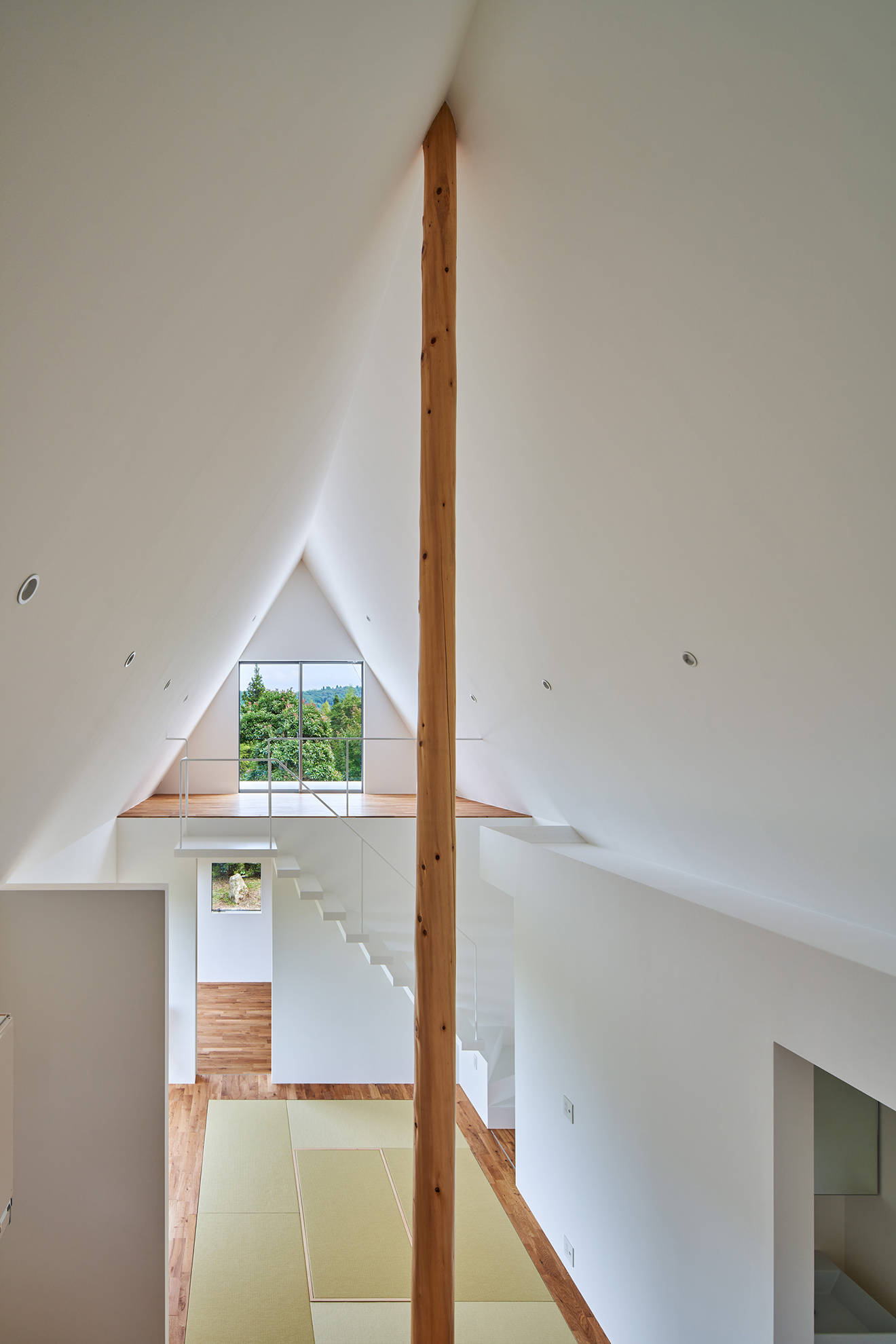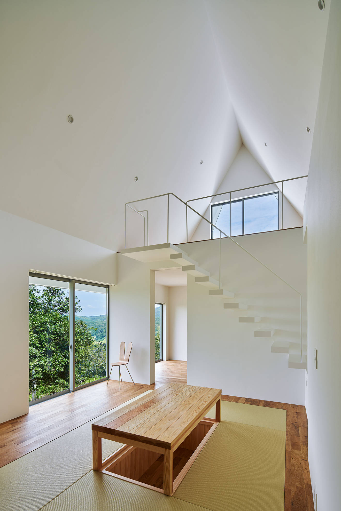 普段から自然と近い距離で生活していることから、自然と一定の距離感を取るとともに、普段の視覚では感じることのできない景観を切り取り、新たな視点で自然を感じる建築を考えました。建物の形状は、元々の寄棟であった為、土地との親和性のある建物形状にするとともに、冬季の積雪を考慮し、勾配のある屋根を計画しました。平家のボリューム感で、屋根の下は全ての空間が連続し外部へ誘導されます。内装については、シンプルな色味にしたいという要望から、白色を基調とし、部屋の統一感を高めた広がりのある空間としています。南東側の屋根の寄棟妻側は開口部とすることで、空気の通り抜けや自然環境を切り取り、空や木々が迫ってくるような計画としています。現在は、平家であるが、屋根裏が特別な場所に変わるとともに、将来的に2階として利用できる建物としても計画しています。市街地とは違い、自然に囲まれた新鮮な空気の中で、母家と離れの新しい暮らしが始まります。
