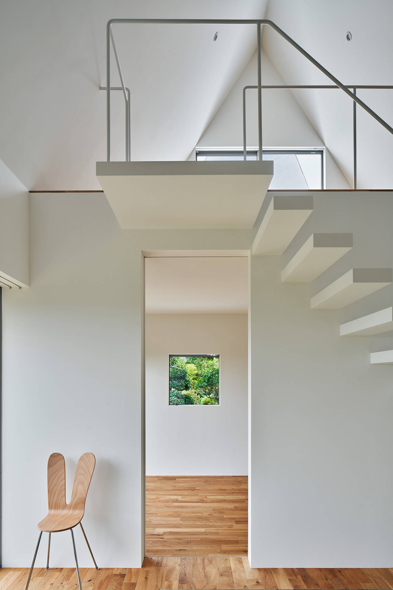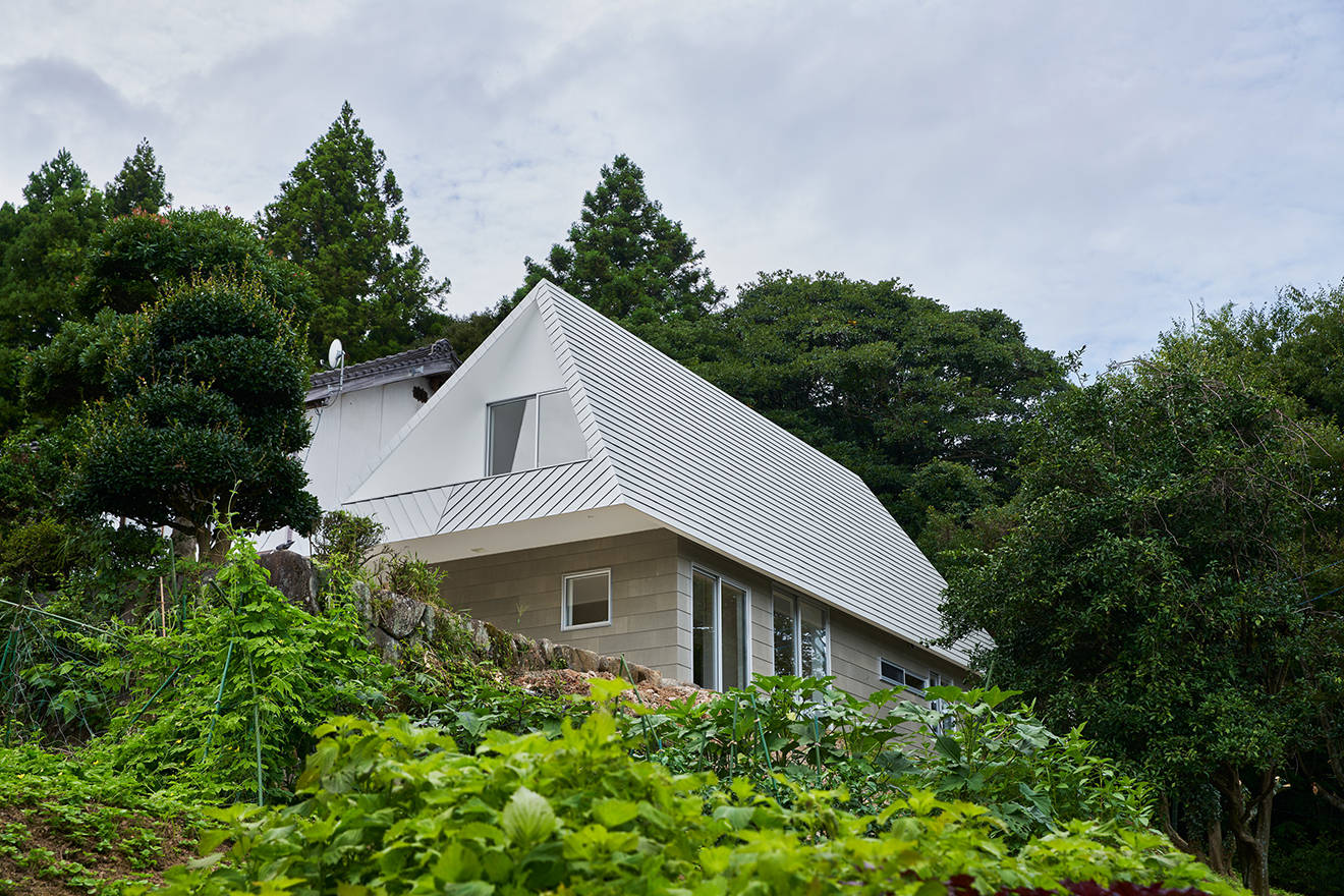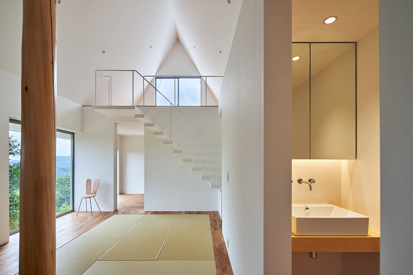 普段から自然と近い距離で生活していることから、自然と一定の距離感を取るとともに、普段の視覚では感じることのできない景観を切り取り、新たな視点で自然を感じる建築を考えました。建物の形状は、元々の寄棟であった為、土地との親和性のある建物形状にするとともに、冬季の積雪を考慮し、勾配のある屋根を計画しました。平家のボリューム感で、屋根の下は全ての空間が連続し外部へ誘導されます。内装については、シンプルな色味にしたいという要望から、白色を基調とし、部屋の統一感を高めた広がりのある空間としています。南東側の屋根の寄棟妻側は開口部とすることで、空気の通り抜けや自然環境を切り取り、空や木々が迫ってくるような計画としています。現在は、平家であるが、屋根裏が特別な場所に変わるとともに、将来的に2階として利用できる建物としても計画しています。市街地とは違い、自然に囲まれた新鮮な空気の中で、母家と離れの新しい暮らしが始まります。