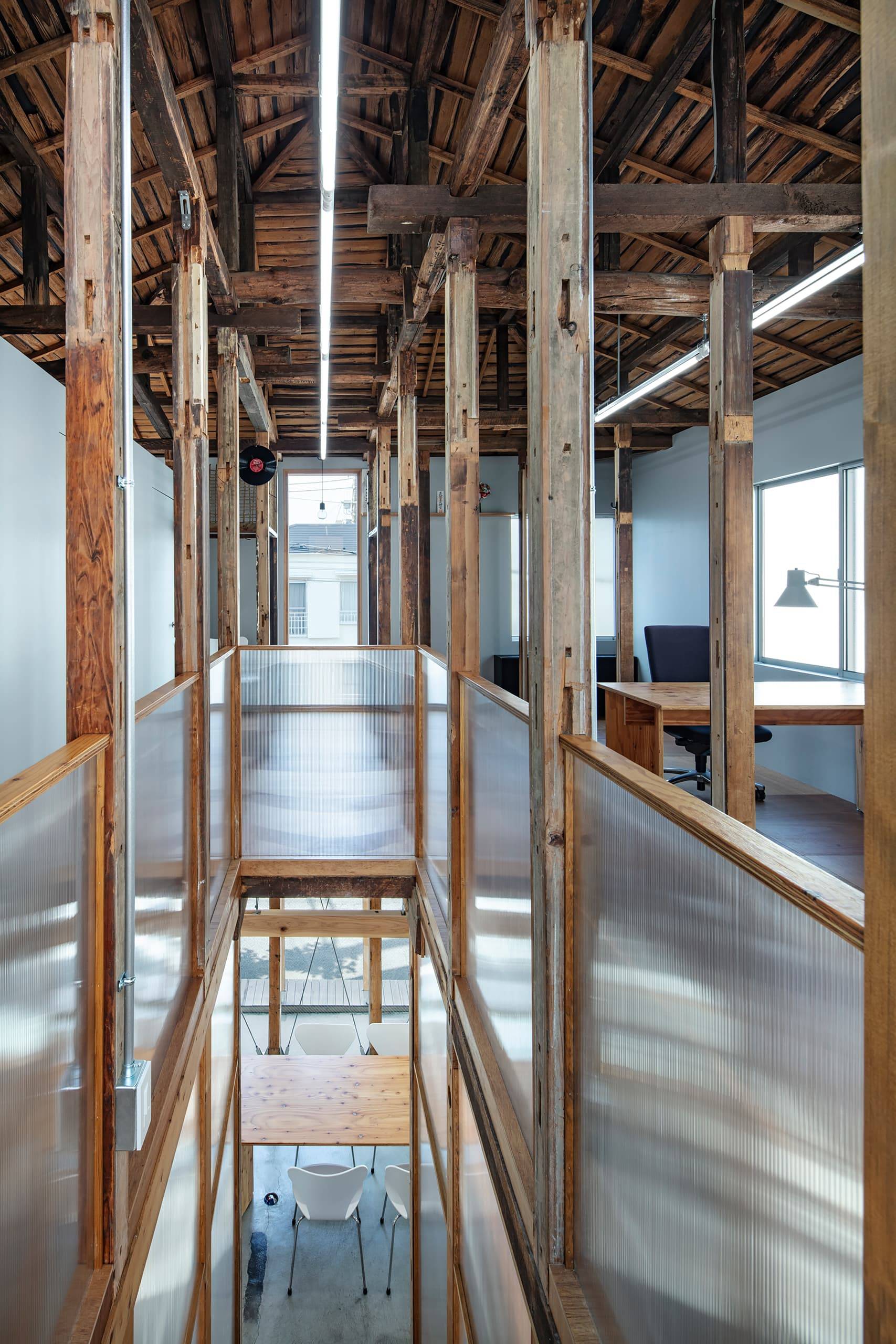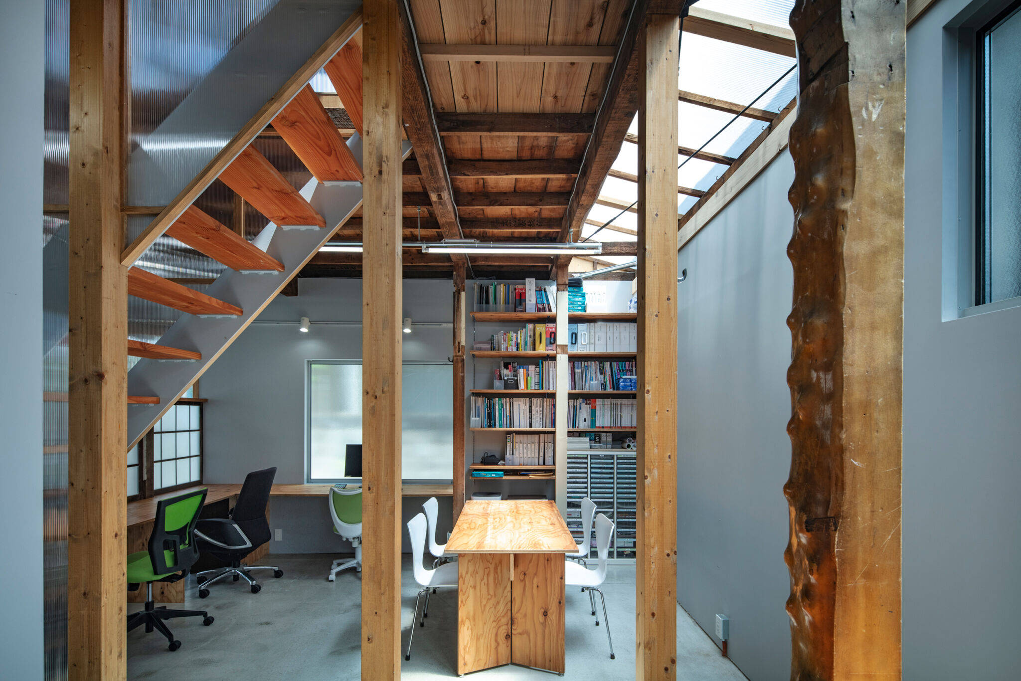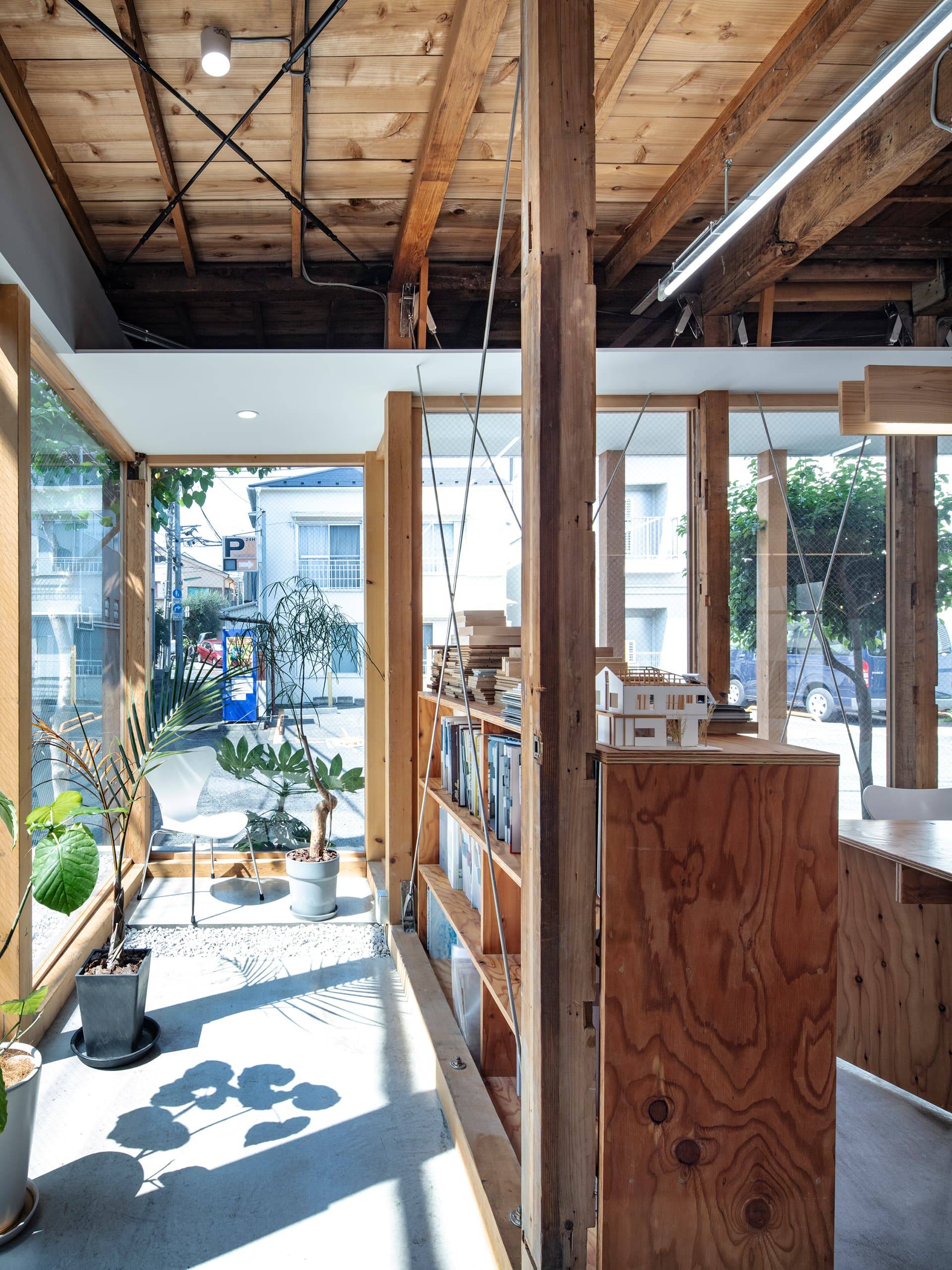 道路と接していれば、縁側のような中間領域となる。近接している客席やギャラリーとは目線の高さが異なり、それぞれが気兼ねなく自由に過ごすことができる。執務スペースの奥では、トップライトから光が取込まれ、半間の窓からは街を見通すことができる。そこだけ外部が入り込んだような環境では、off-timeな時間が流れる。階段を上った先に空が見える体験は、建物が密集している都心においては特別に感じる。半間幅だけ増築されていた部分は解体し、生まれた庭を「半間の庭」と名付けた。