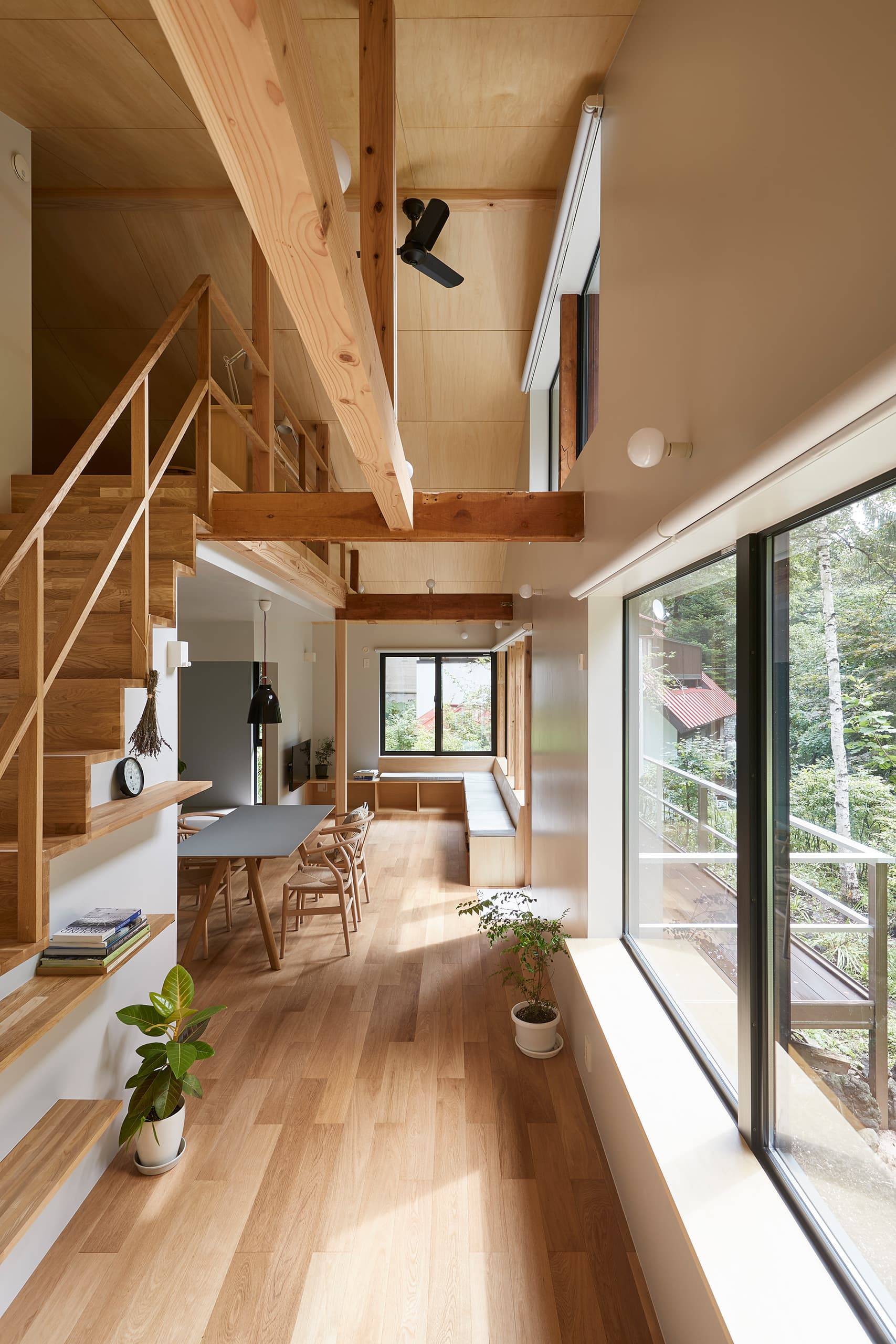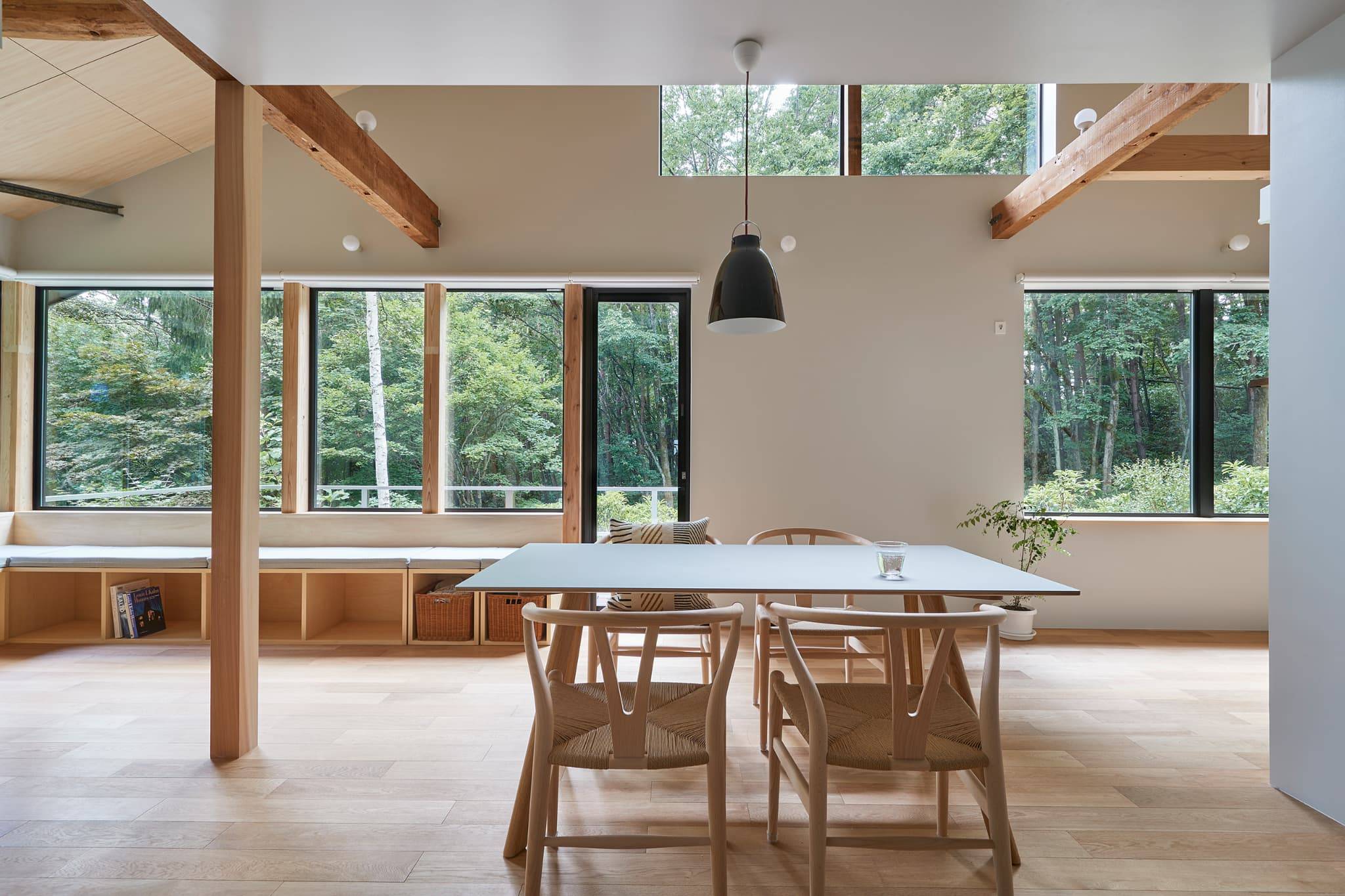 森側は長手方向を通して気積を最大限に広げ、大屋根に包まれた森と対峙する空間とした。窓は横長のプロポーションとし、パノラマに広がる森の景色を切り取った。