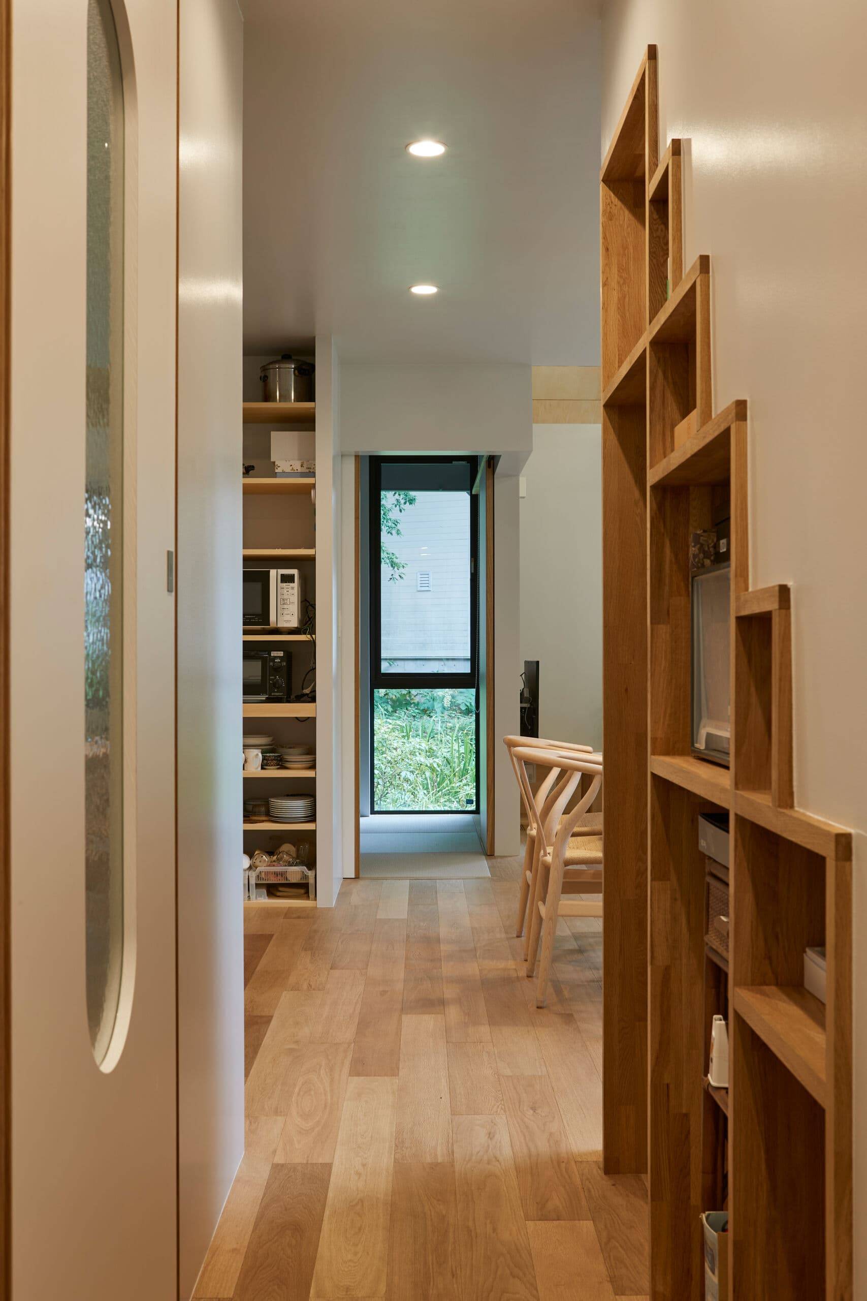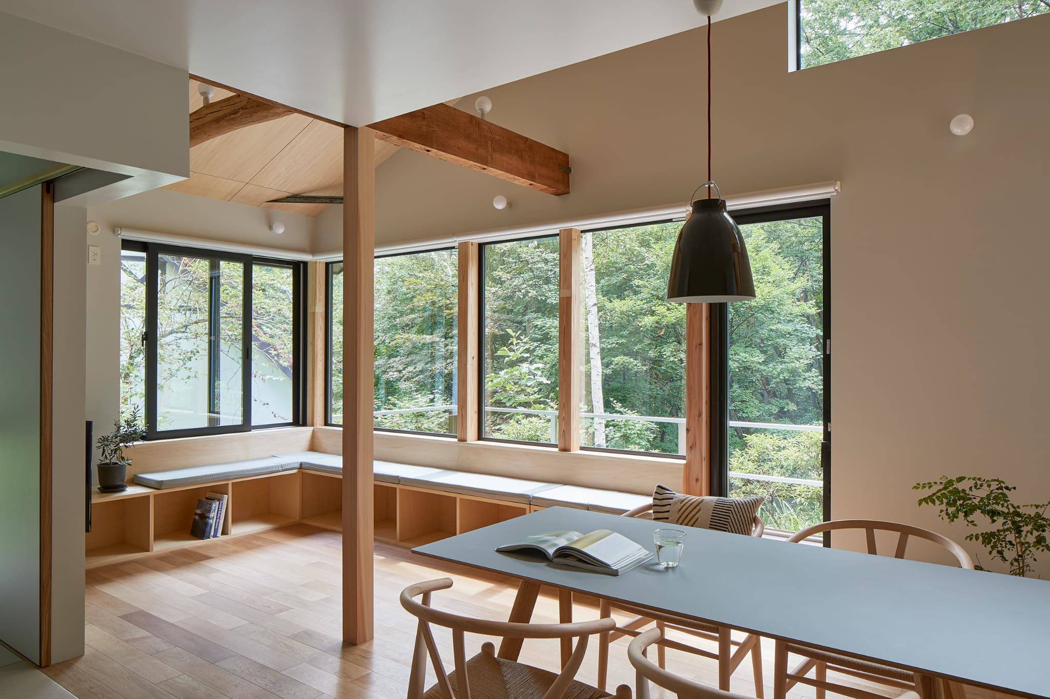 窓は掃き出し窓とせず、歩道を散歩する人の目線を切り離し、森との関係性の純度を高めている。