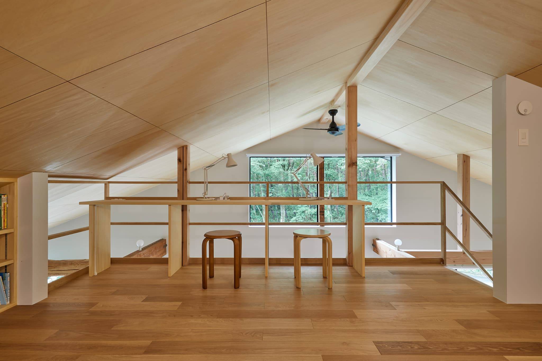 屋根の勾配に沿って上った階段の先には読書机を設け、静かに森を眺めるパーソナルな場所とした。