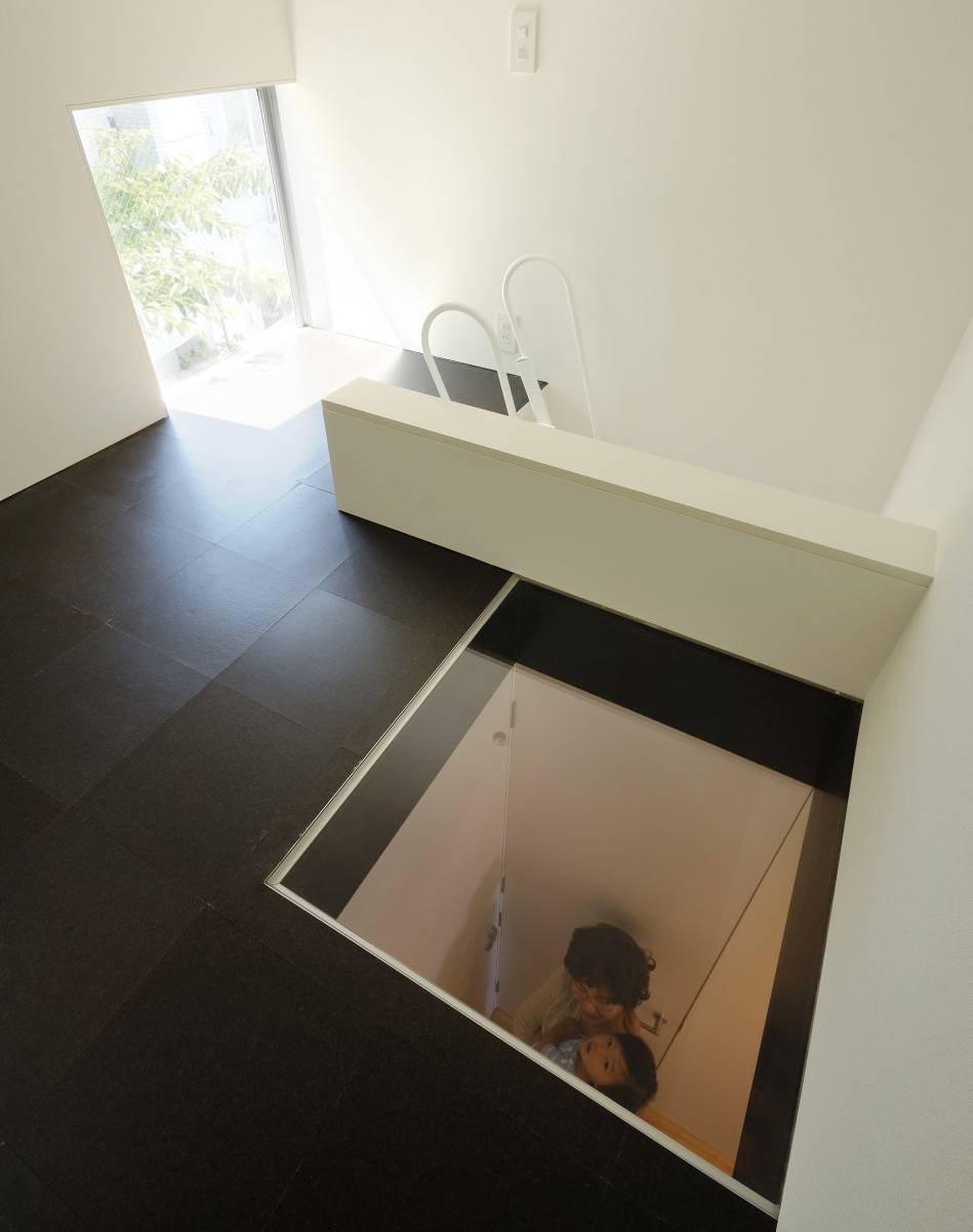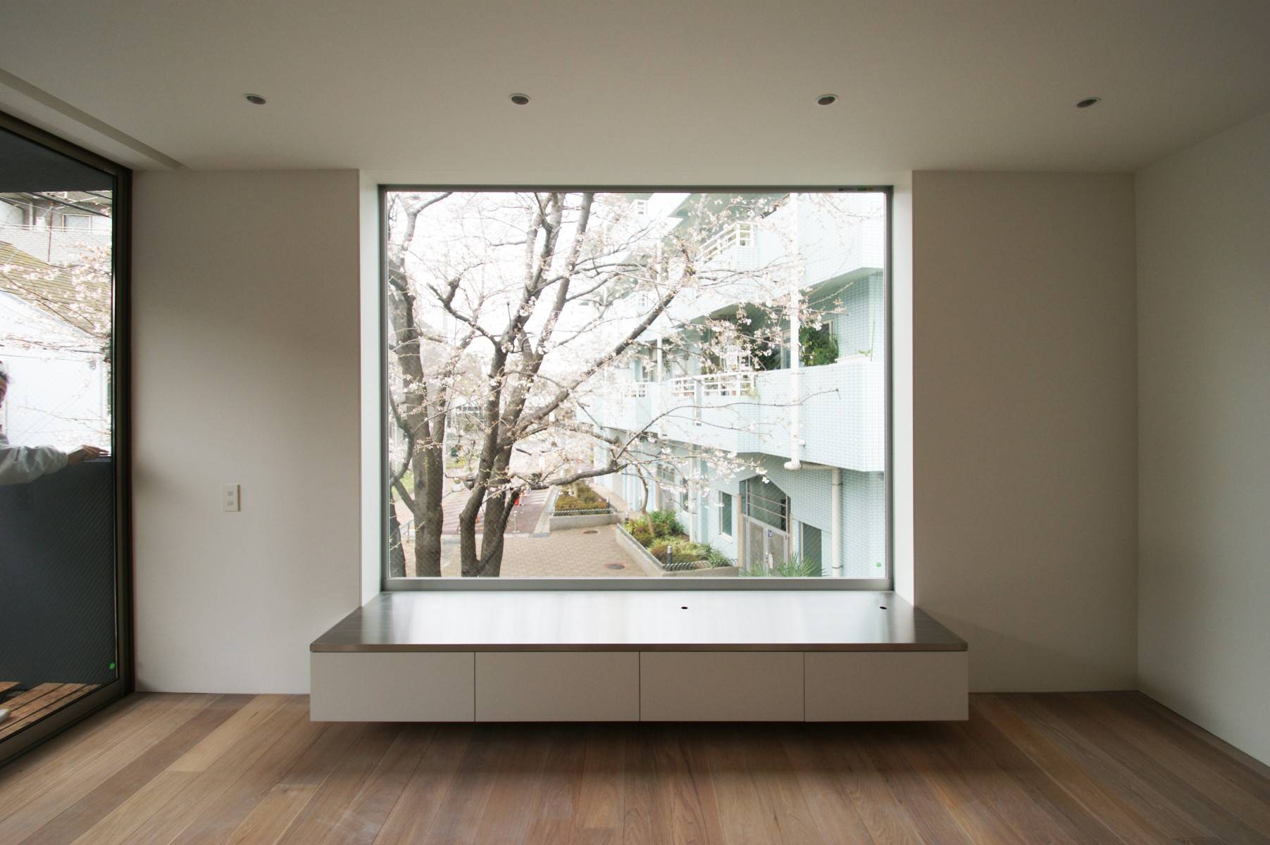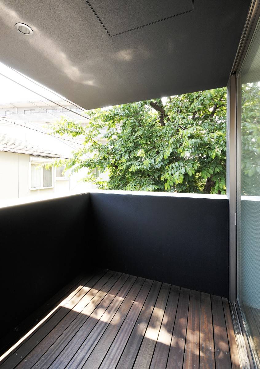 白い箱を必要に応じてえぐり取り、残った箇所に機能とデザインを付加した。リビングのピクチャーウィンドウは隣地の桜の大樹を絵画化し、黒く塗りつぶしたテラスは桜の大樹を切り取り内部空間に豊かさを取り込む。