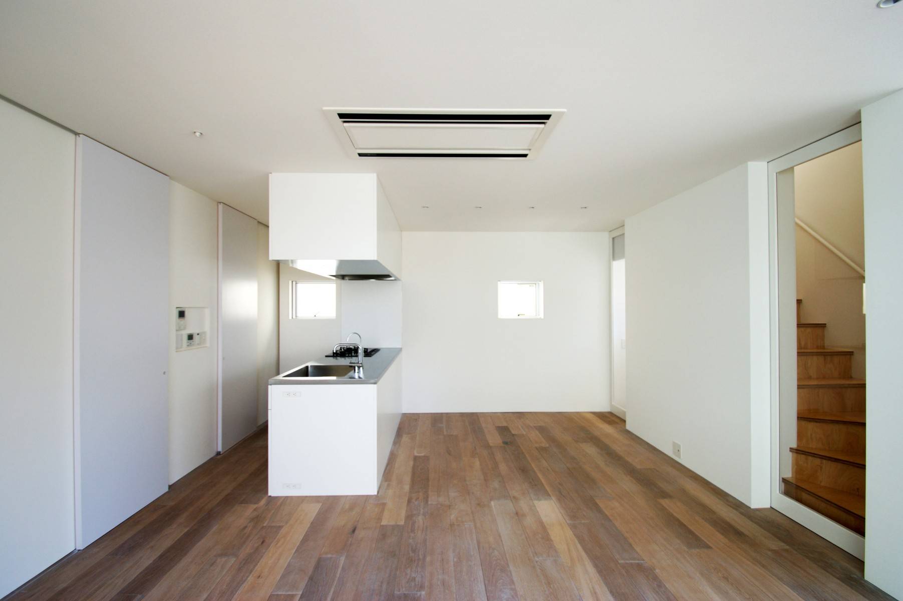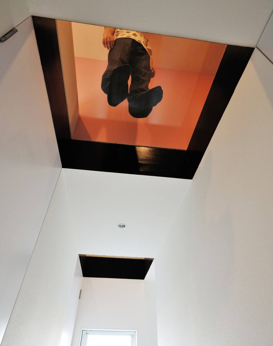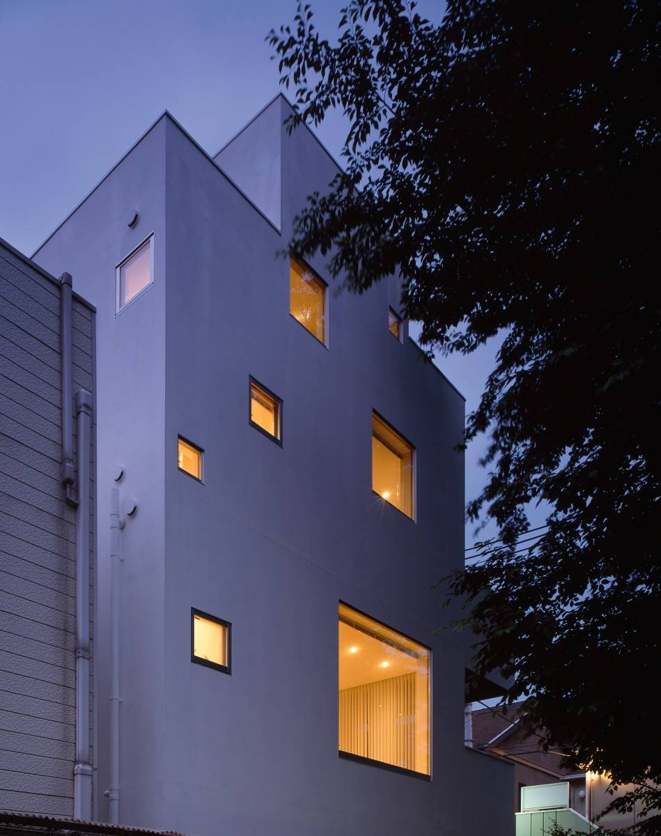 白い箱を必要に応じてえぐり取り、残った箇所に機能とデザインを付加した。リビングのピクチャーウィンドウは隣地の桜の大樹を絵画化し、黒く塗りつぶしたテラスは桜の大樹を切り取り内部空間に豊かさを取り込む。