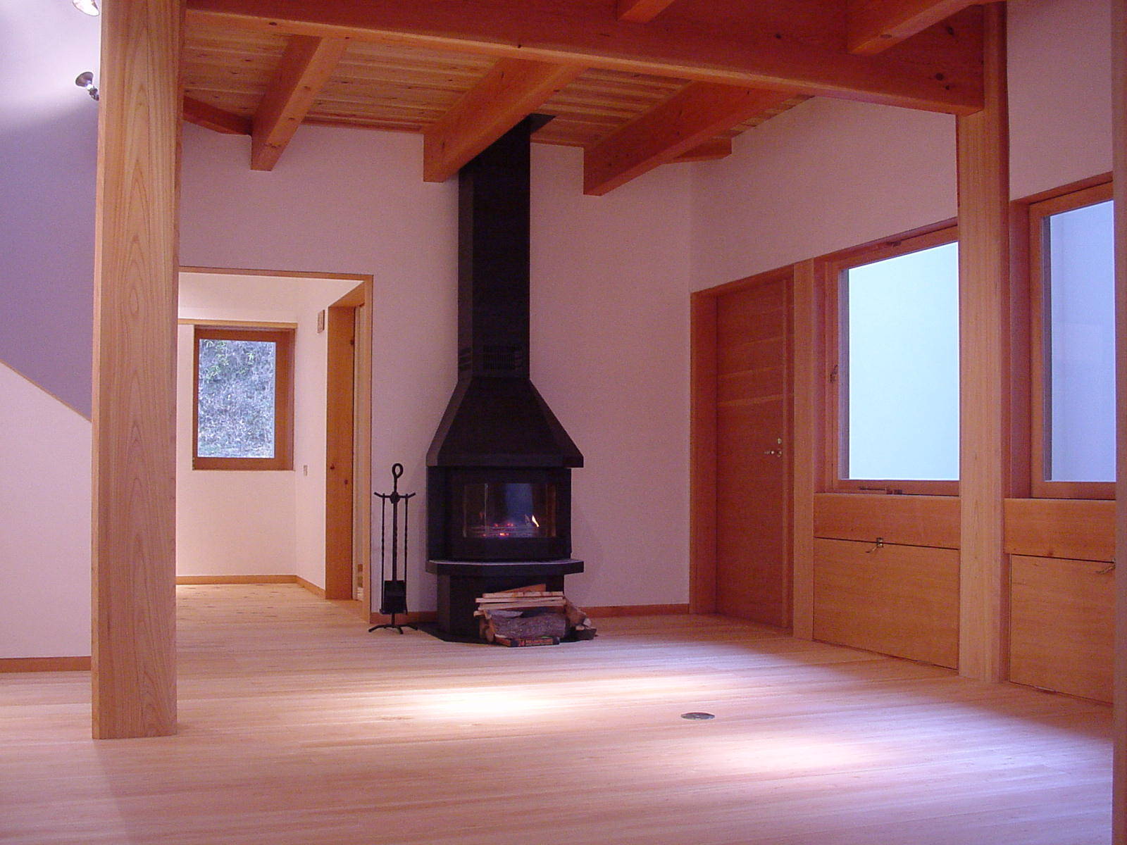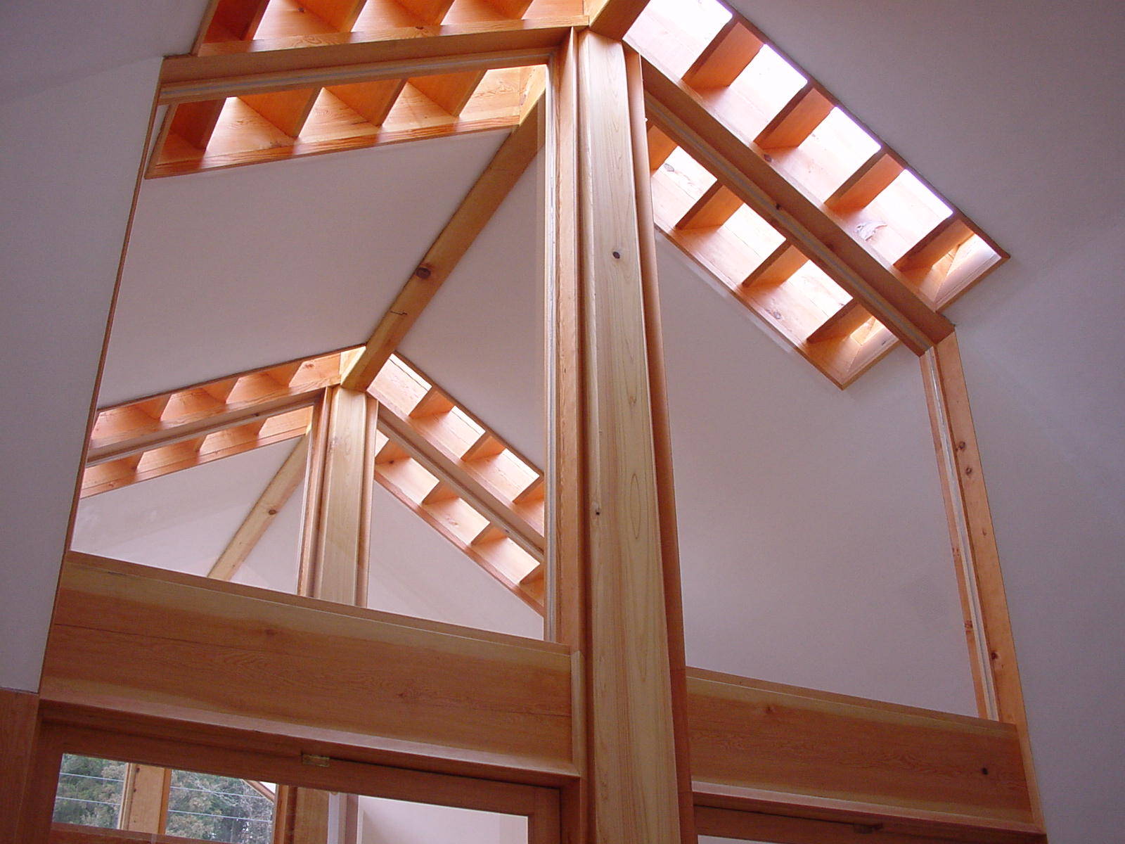 麦畑の広がる田園に建つ家は力強く架構された木造住宅。