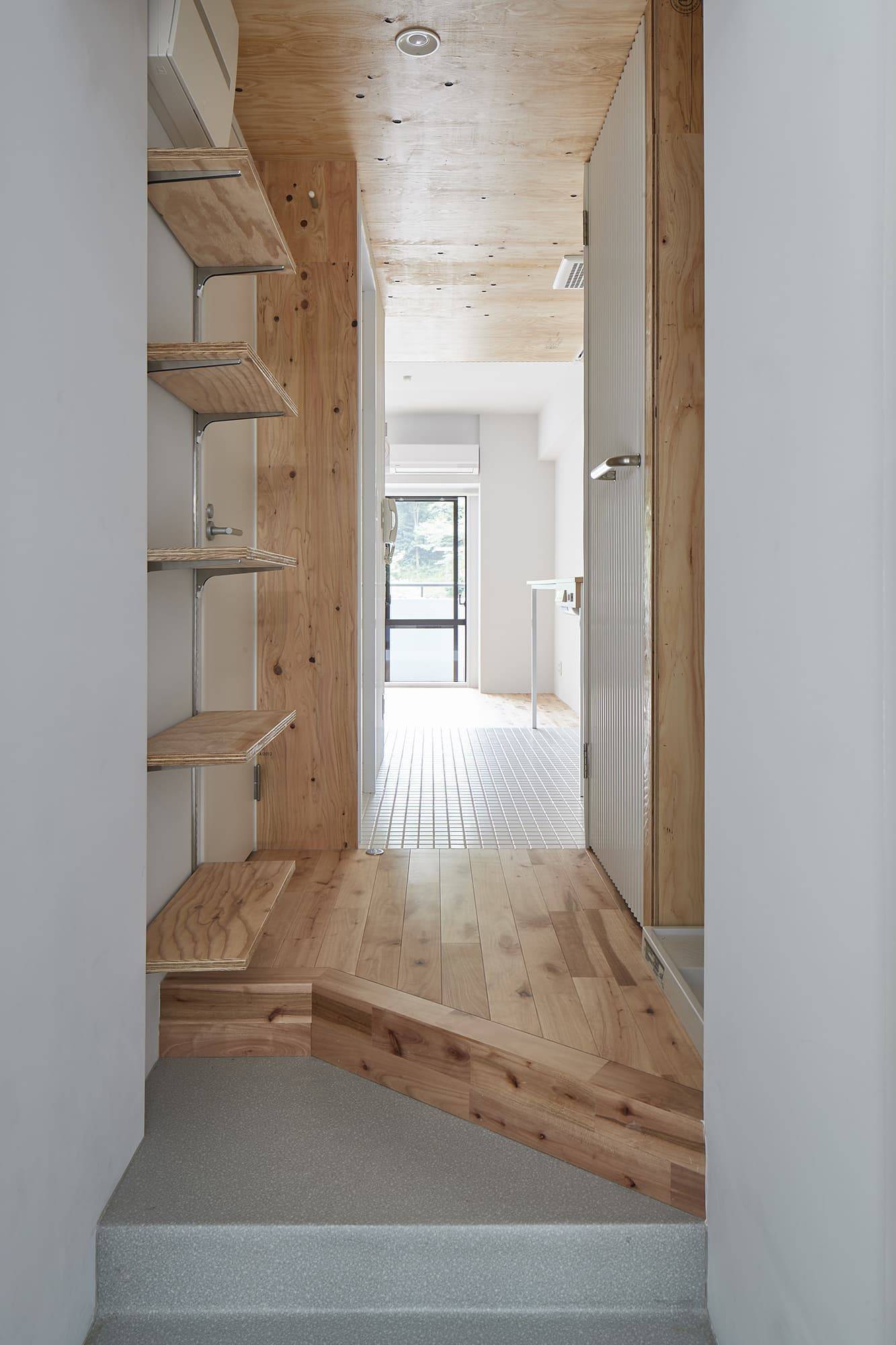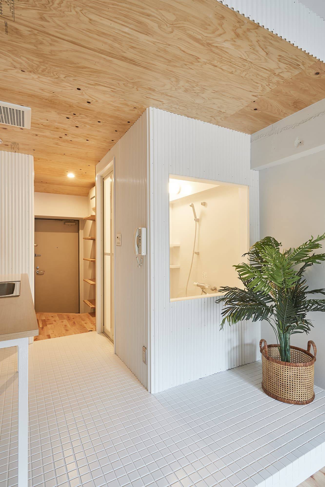 1人暮らし用のワンルーム賃貸住戸リノベーション計画です。都心にいながら緑を感じることができるこの住戸において、外の景色を活かしつつ住戸内にも植物を飾ってゆったりと暮らせるような住まいの計画を考えました。30年以上前の一般的なワンルーム分譲賃貸では室内面積や投資利用などの理由からお風呂やキッチンに予算をかけていない住戸を散見します。例え1人暮らしの賃貸であっても、働いて帰ってきた家でゆったりとお風呂に浸かって次の日を快適に迎えてもらいたいと考え、20㎡程度の小さな部屋にお風呂を独立して設け、そのお風呂からは外の景色が見えるように大きな窓を設けました。またお風呂の窓の外には観葉植物を飾ることもできるタイル貼りのガーデニングスペースを設けました。ここに植物を飾ることでお風呂から室内の緑を見ながら過ごすことも出来ます。