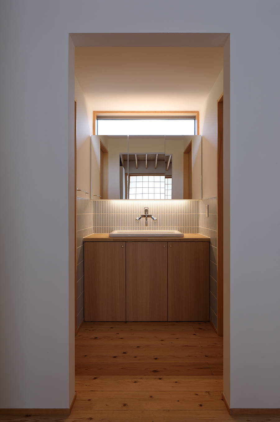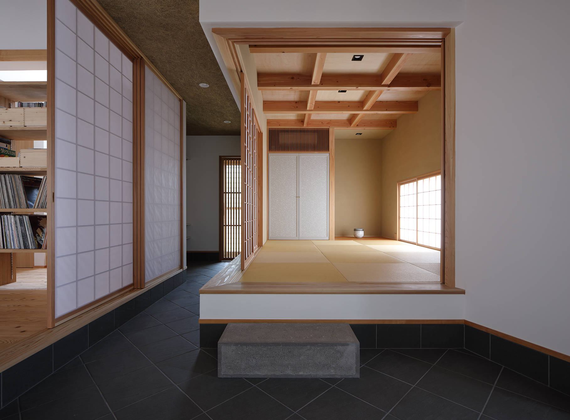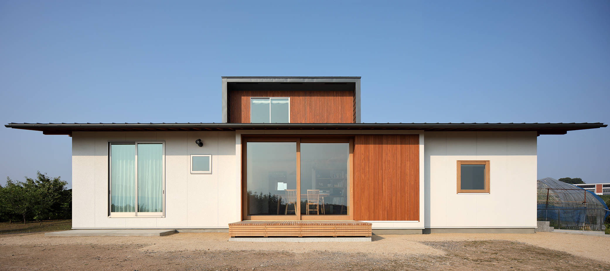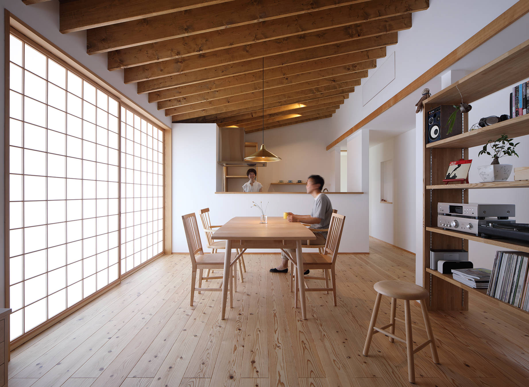 大きな玄関土間、屋内離れの和室があり、基本的な夫婦の生活は1階で完結しており、2階は子ども室とWCがチョコンと載っています。広間の大窓は建主さんのご要望でもあるフルオープンできる木製建具。雨戸、網戸、ガラス戸、障子が仕込まれており、季節や時間に応じて開閉することで快適な室内空間を確保することができます。