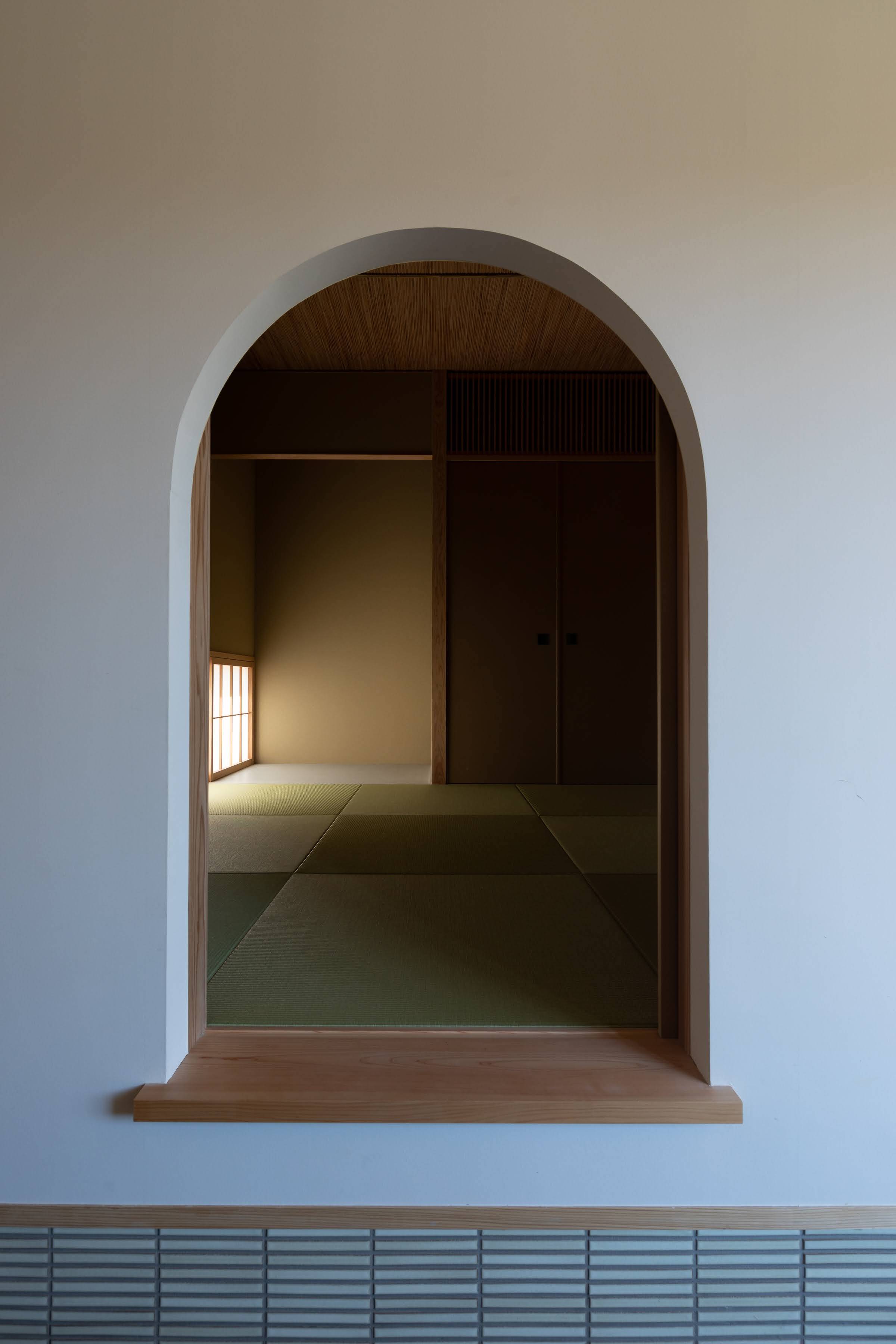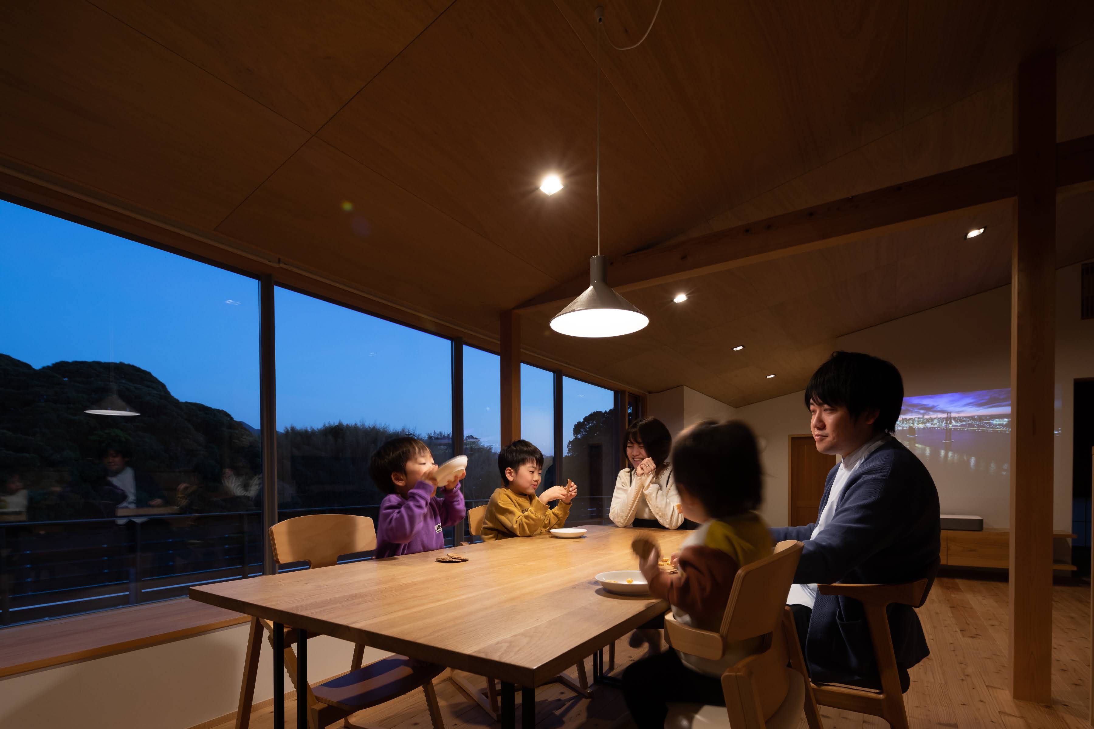 高台から湖を望めることもあり、一番眺望が良い場所に大きな出窓を設けています。この出窓は湖を眺めるだけではなく、ベンチや子どもたちの遊び場になったりと、居場所の1つとして機能しています。広間の勾配天井は更に奥へと繋がり、広がりや奥行きをもたらします。