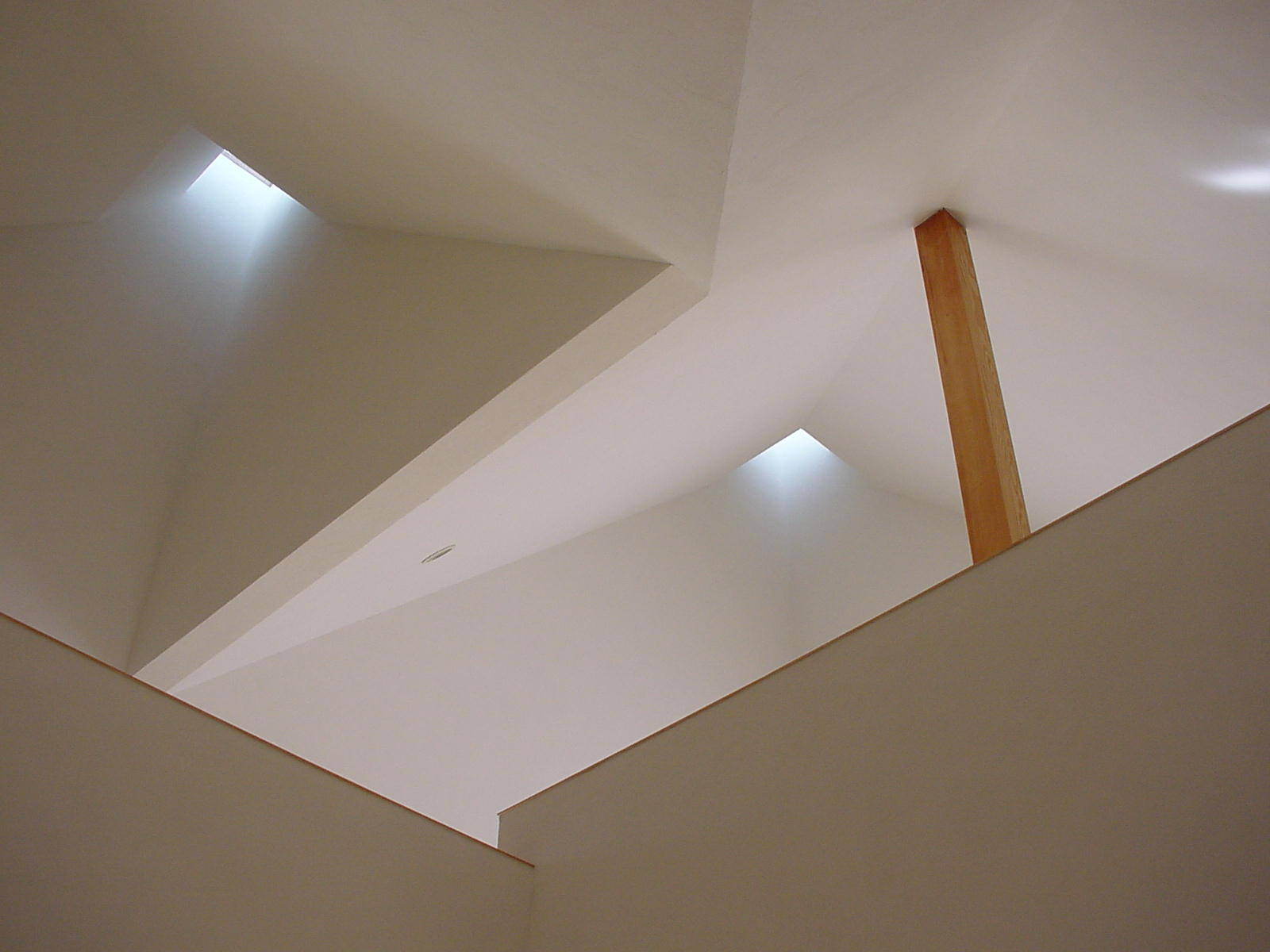 緑の丘に、コーン状の木造住宅。天井からの光、窓から光美し...