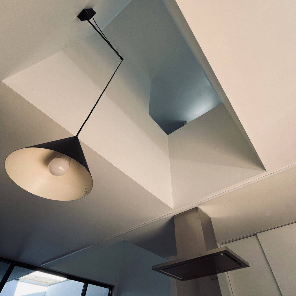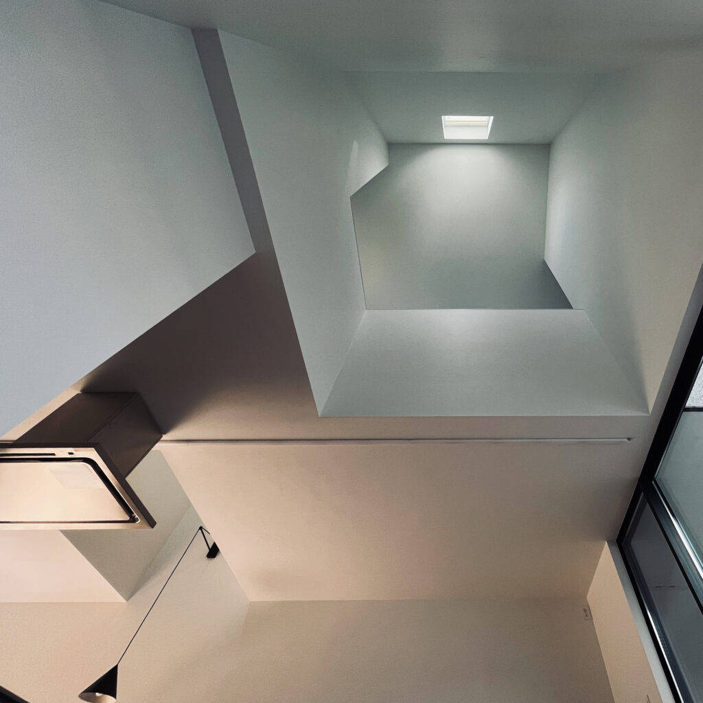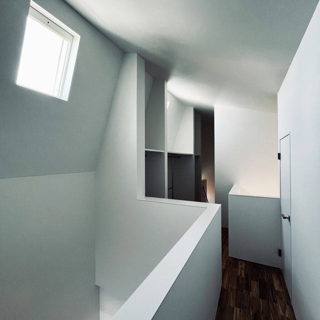 大きな吹き抜け一つでダイレクトに階を繋ぐのではなく、大小2つの吹き抜けを千鳥状に配置し、上下階の家族の気配が滲む吹き抜けにしました。太陽の光も、これらの吹抜けのトップライトから浴びれます。白く光沢のあるクロスにすることで、日の光とフローリングの相互反射が室内にうつろっていきます。