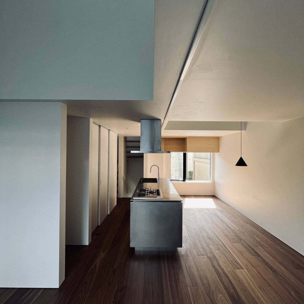 造作のステンレスキッチンを中心にした視線の抜ける LDKの二階と寝室フロアの三階を繋ぐ二つの吹き抜け。
