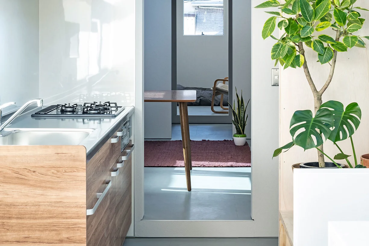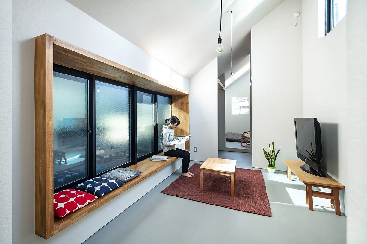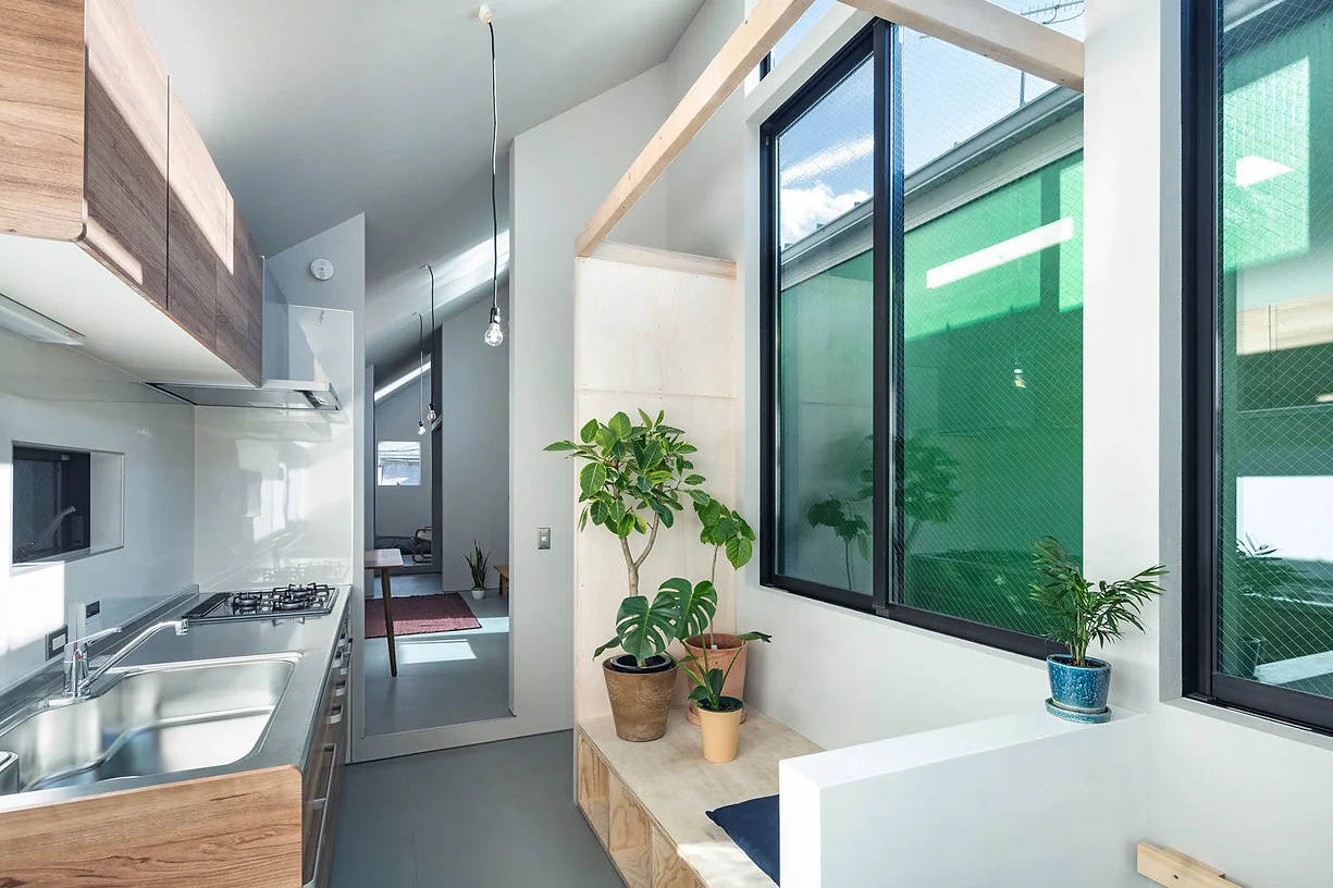 敷地形状の広がった部分を利用し、斜めに壁を入れ、道からのアイキャッチと耐震要素として有効な壁を設けた。出窓部分は500㎜の壁面後退をかわせるため、ベンチや本棚としての窓間を設け、窓自体が家具のような人の居場所として設計している。キッチンの後ろには開口を大きく取り、簡易的なサンルームとした。