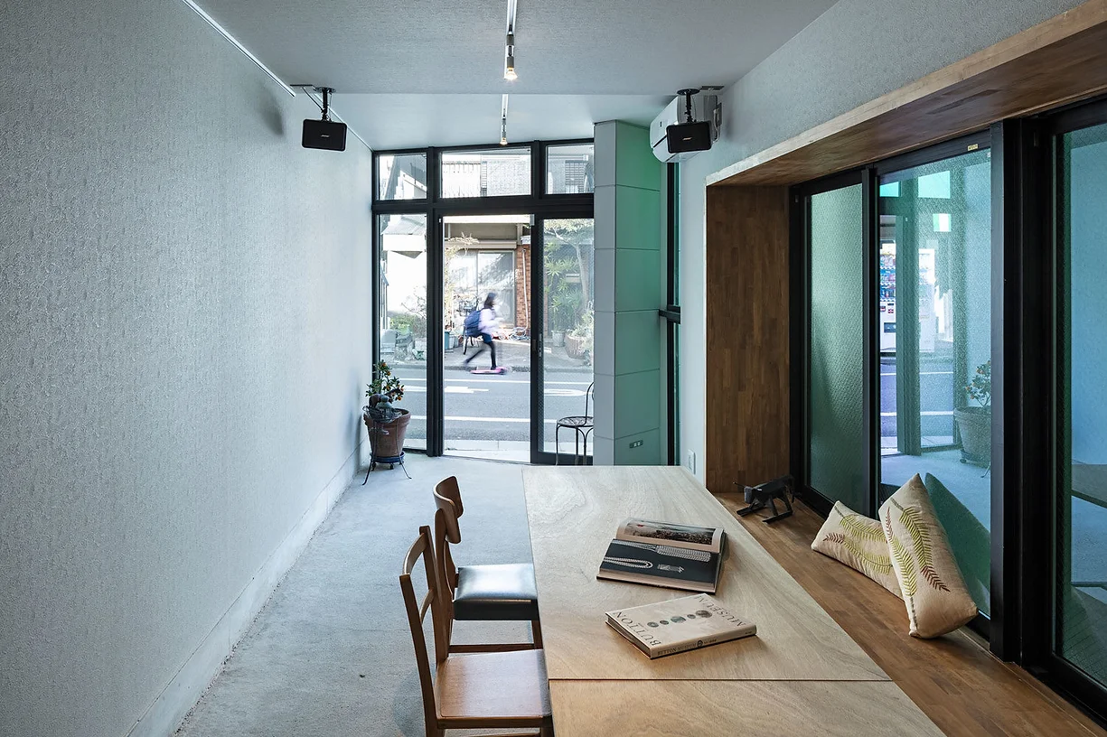 主に1階は店舗、2階を住居部分とし、1階は2面ともから通り抜けられる構成とした。外部から見たときに長さを強調するように、断面的に入り口に向かってだんだんと上がるフロアとした。
