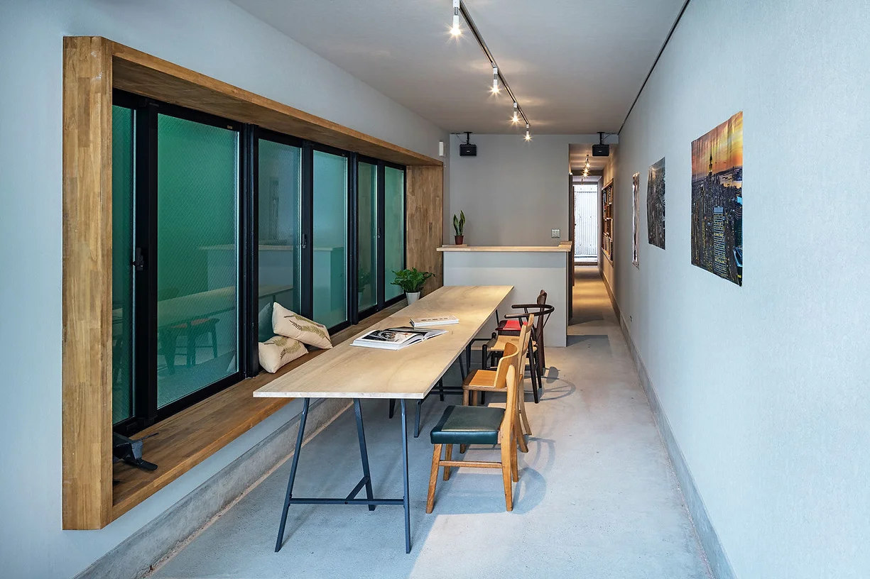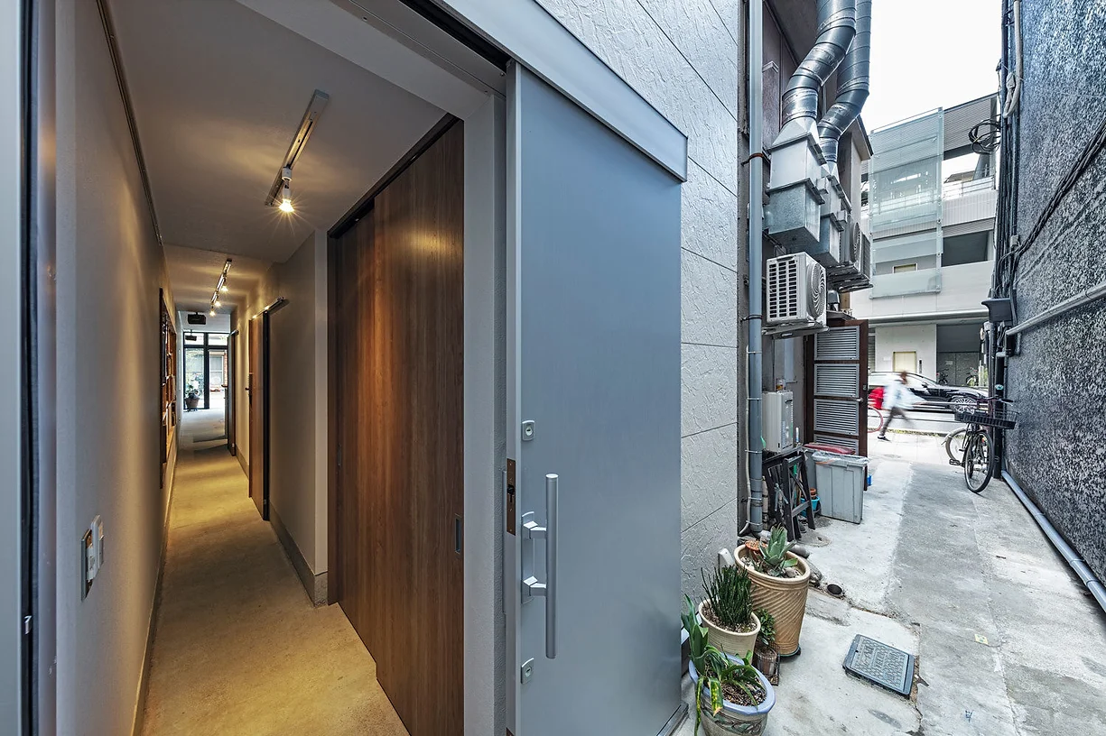 敷地形状は接道している部分のみ広がっており、それ以降は間口が3.5mと細く、隣地境界からの壁面後退が500㎜以上と地区計画で定められていた。奥行きは長く18mもあり、細い路地で大きな道に接道している。上記から短手の芯々は2.5mとなり、極端に細長いプロポーションとなる。様々な居場所を住宅でも店舗とも通路が貫通し、場所の違いを楽しむような建築を提案した。